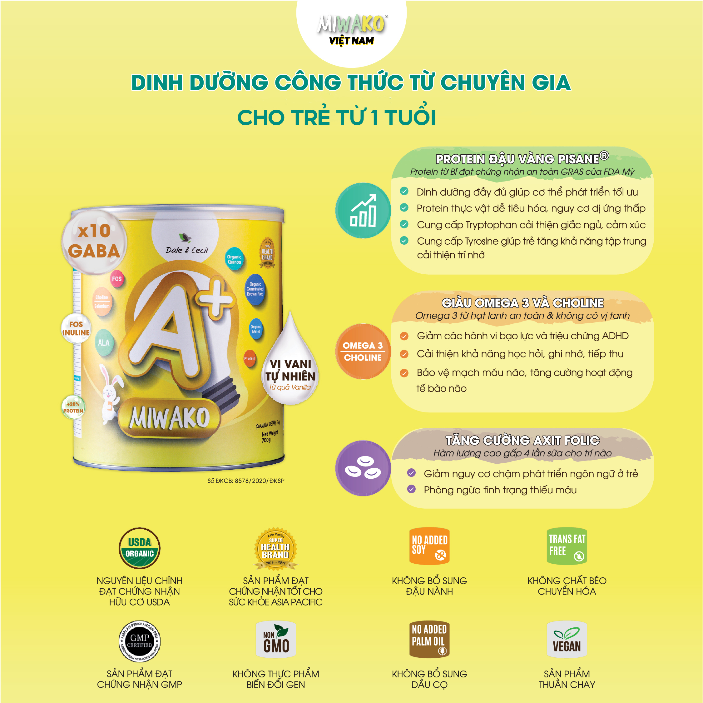 Combo 4 Hộp 400g Sữa Công Thức Hữu Cơ Miwako A+ Vị Vani, Sữa Hạt Cho Bé Phát Triển Trí Não Chiều Cao THÔNG TIN SẢN PHẨM SỮA HẠT MIWAKO A+, SỮA HỮU CƠ CHO