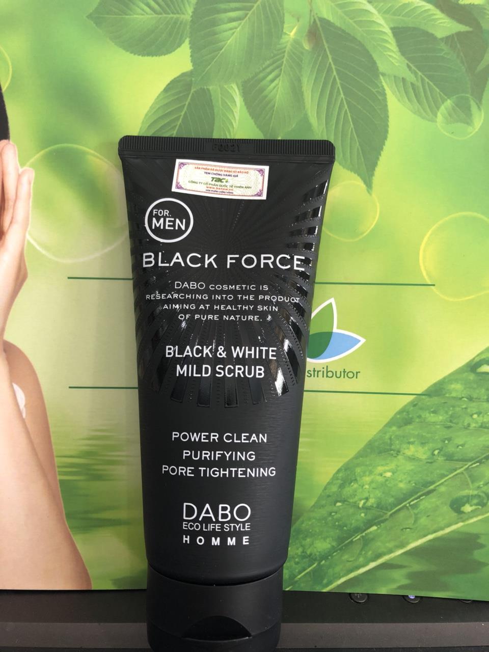 Sữa rửa mặt dành cho nam Dabo Black Force Black & White Mild Scrub với công thức độc đáo kết hợp giữa than hoạt tính, bùn khoáng, chiết xuất ngũ cốc, trái cây và tinh chất trà xanh giúp làm sạch da, giảm thiểu bã nhờn, bụi bẩn trên bề mặt da và tận sâu trong lỗ chân lông, ngăn ngừa mụn hiệu quả. Đồng thời, sản phẩm còn có khả năng cải thiện tông màu da, làm chậm quá trình lão hóa và giảm bỏng rát, kích ứng khi cạo râu.