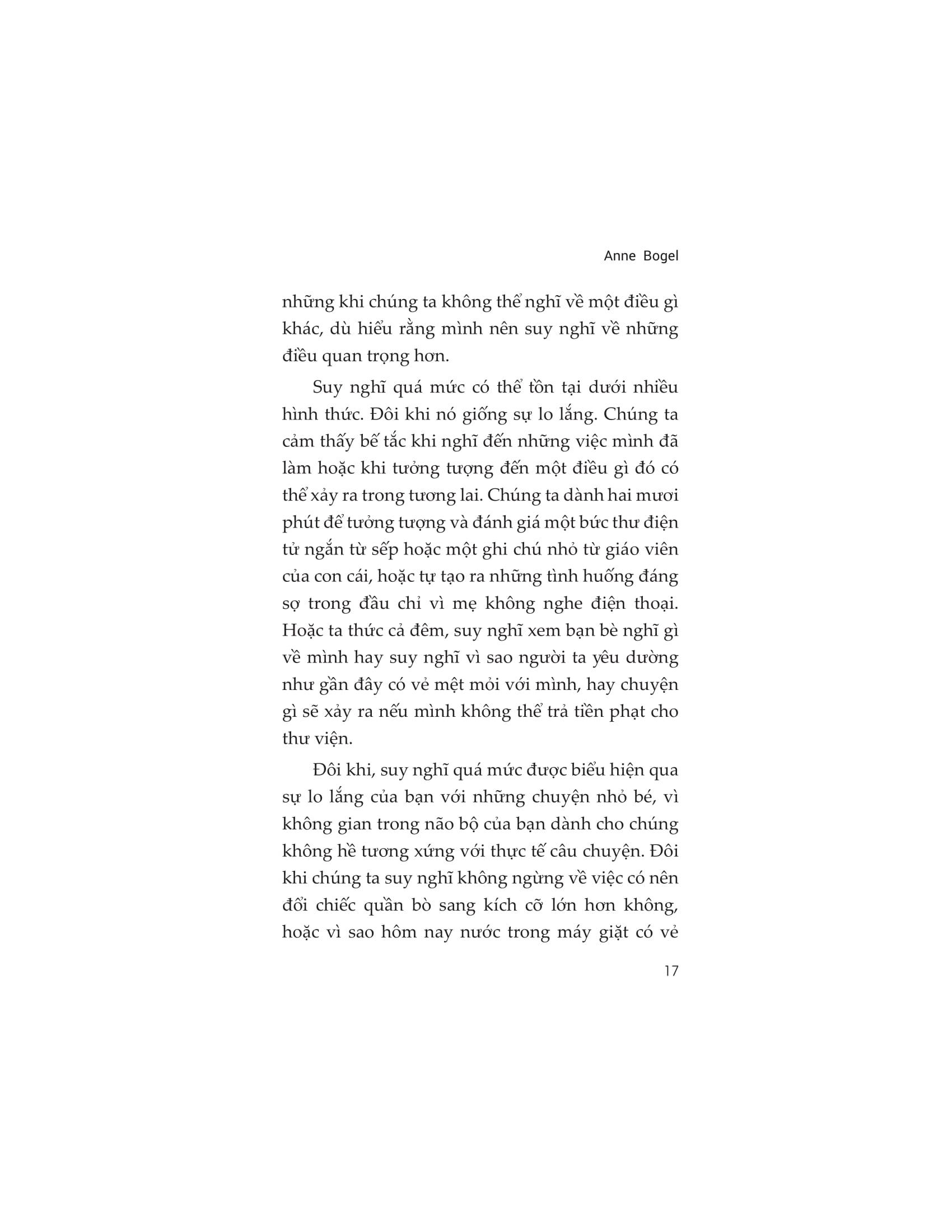 thể xảy ra trong tương lai. Việc cứ nghĩ ngợi quanh đi quẩn lại làm chúng ta cảm thấy không thoải mái chút nào, nhưng nếu không có những nguyên tắc hoặc triết lý nhất quán hướng dẫn, chúng ta dường như không thể tự cứu rỗi chính mình. Dù những mối bận tâm của bạn lớn hay nhỏ thì chúng đều có điểm chung: những suy nghĩ đó lặp đi lặp lại, không hề lành mạnh và hết sức vô ích.