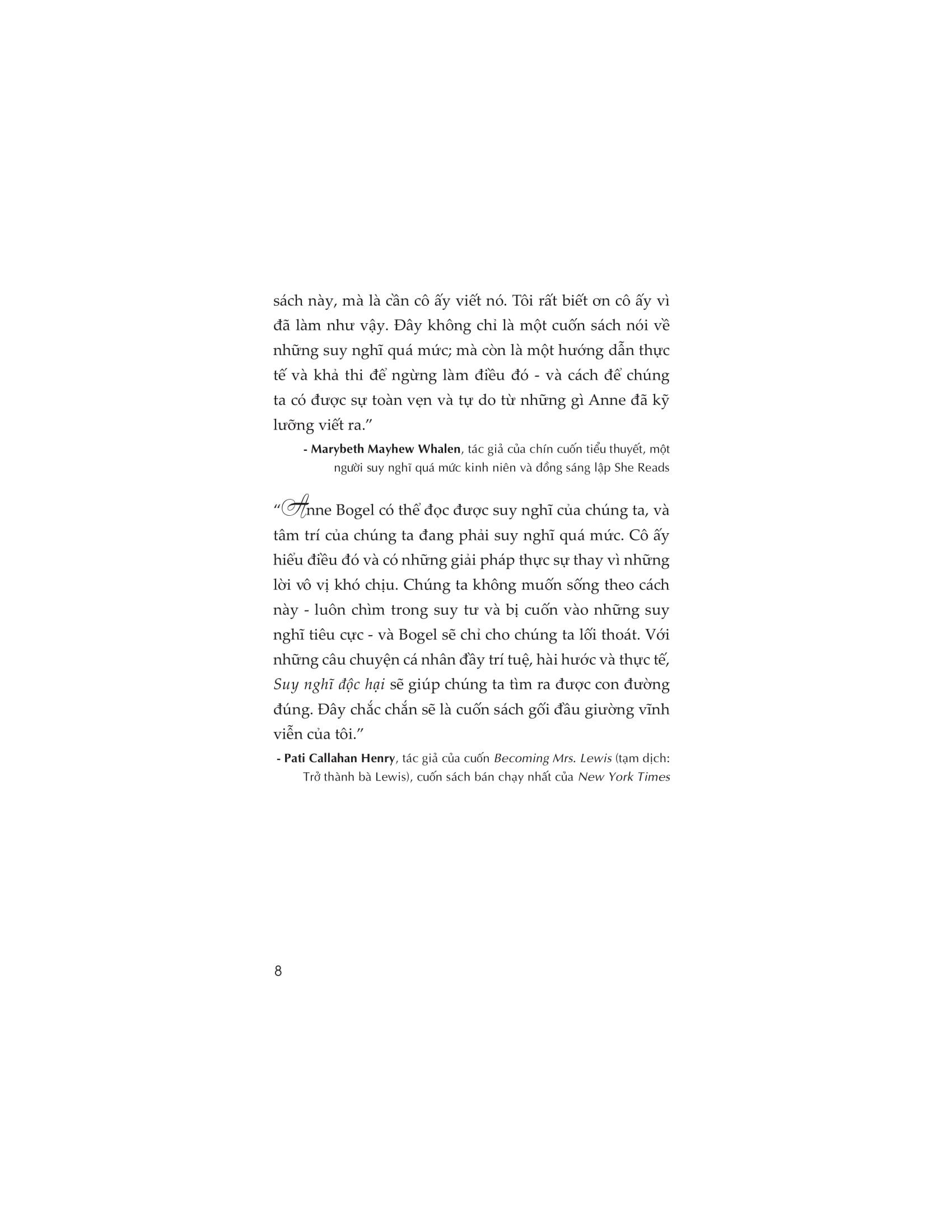 “Việc suy nghĩ quá nhiều về những quyết định và vấn đề có thể phí hoài vô số thời gian của bạn. Trong cuốn sách tích cực và truyền cảm hứng này, Anne đã cung cấp cho độc giả một cách để thoát khỏi cạm bẫy tinh thần đó và giải phóng không gian cho những cuộc phiêu lưu khác trong cuộc sống.”