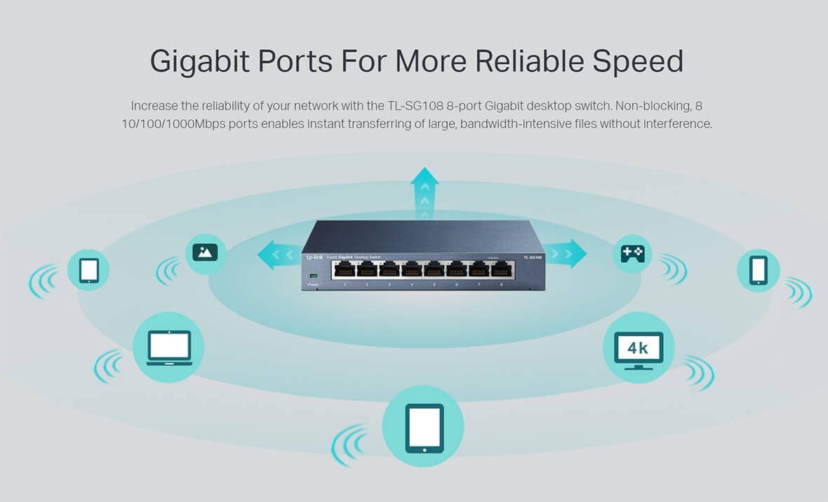 Với tính năng 8 cổng tốc độ 10/100/1000Mbps, TL-SG108 mở rộng 1 cách tối ưu dung lượng mạng của bạn, kích hoạt sự truyền tập tin ổn định hơn. Vì thế, lượng người dùng trong nhà, văn phòng, nhóm làm việc, hay môi trường sản xuất sáng tạo bây giờ có thể gia tăng thêm, những tập tin băng thông lớn sẽ nhanh hơn.Truyền những tập tin đồ họa, CGI, CAD hoặc truyền thông qua mạng 1 cách ổn định.