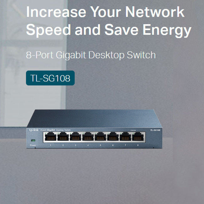 TP Link TL-SG108 - Switch Để Bàn 8 Cổng Gigabit cung cấp cho bạn 1 giải pháp dễ dàng để tạo sự chuyển đổi sang Gigabit Ethernet. Làm tăng tốc độ máy chủ của bạn và kết nối đường truyền chính, hoặc làm cho loại Giagabit máy bàn thành thực tế.Hơn nữa, TL-SG108 cung cấp sự thiết kế tiêu thụ điện ít hơn. Với công nghệ tiết kiệm điện năng động, TL-SG108 có thể tiết kiệm tiêu thụ điện đến 72%, làm cho nó thành một giải pháp thân thiện với môi trường cho căn hộ và văn phòng của bạn.