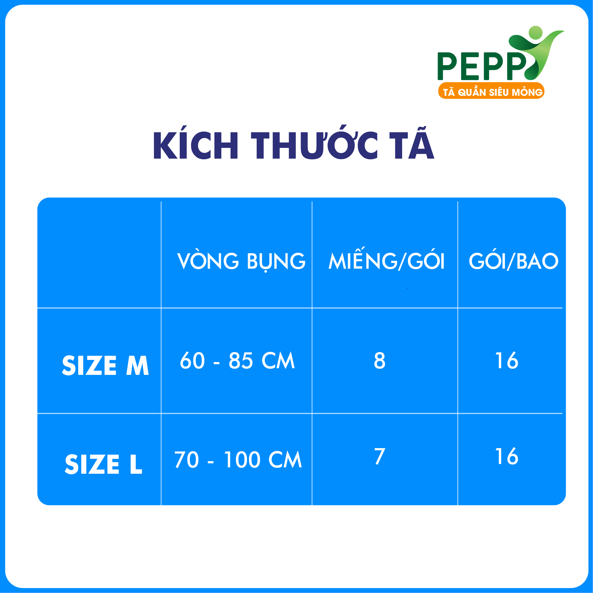 Combo 6 gói Tã/Bỉm Quần Người Lớn, Người Già Peppy Siêu Mỏng, Siêu Thấm, Mềm Mại, Kháng Khuẩn Size M8/L7/XL9 I. THÔNG TIN SẢN PHẨM Thương hiệu: Xuất xứ:Việt Nam Sản xuất tại: Công ty TNHH Javi - Lô LE6-02 Đường số 2, KCN Xuyên Á, Mỹ Hạnh Bắc, Đức Hòa, Long An Thành phần: Vải không dệt, lớp thấm hút thông minh, hạt siêu thấm, bông giấy, vải thoáng khí, thun, keo,… Quy cách đóng gói: Size M 8 miếng/gói, size L 7 miếng/gói, size XL 7 miếng Phân loại: Tã quần người lớn - Siêu mỏng II. ĐỐI TƯỢNG SỬ DỤNG: • Những người bị chứng són tiểu mà vẫn có thể tham gia các hoạt động bên ngoài như đi làm, đi học, đi chơi. • Phụ nữ khi mang bầu có tần suất đi vệ sinh cao,