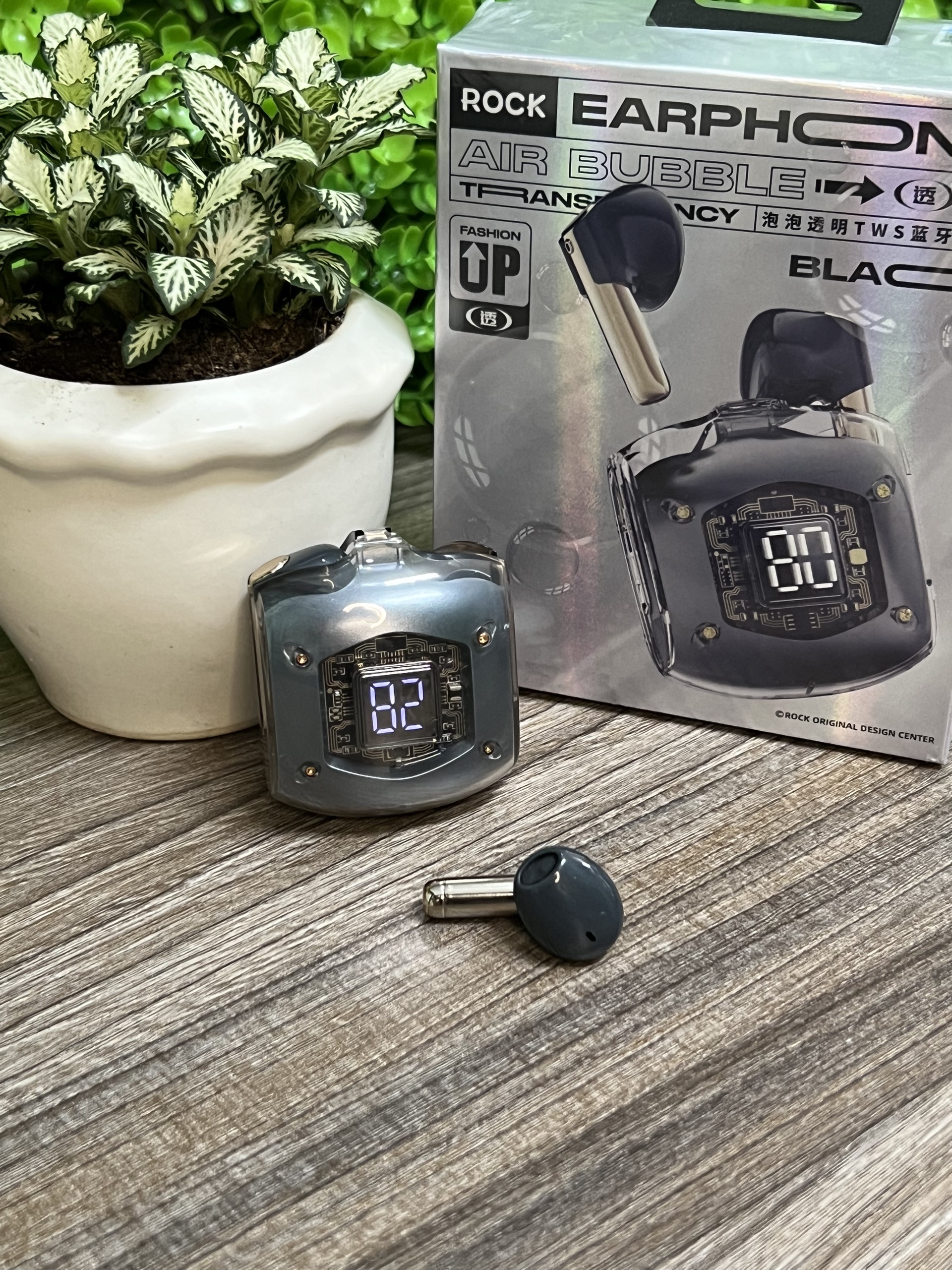 - Tai nghe Bluetooth nhét tai không dây TWS Rockspace Air Bubble được thiết kế trong suốt có tính thẩm mỹ cao, có hiển thị % pin trên hộp sạc. Có dây đi kèm rất tiện lợi