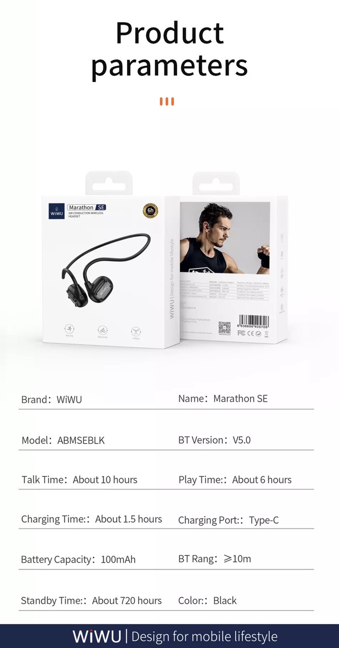 Tai nghe không dây thể thao Wiwu SE Thương hiệu: Mô tả sản phẩm Dung lượng pin: 100mAh Thời gian làm việc : khoảng 6 giờ , tiêu thụ điện năng thấp Tai nghe chỉ