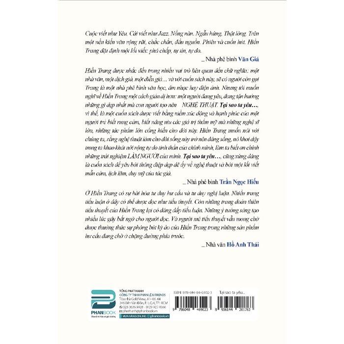 Tại sao ta yêu? là tập hợp 16 bài viết của tác giả Hiền Trang về những nhân vật nổi tiếng trong các lĩnh vực: văn chương, hội họa, âm nhạc, điện ảnh… Điểm chung giữa họ là được Hiền Trang yêu mến, đúng như chính lời tác giả bộc bạch: “Mình tin tất cả những gì mình chọn viết, không chỉ là về văn chương, mà dù là âm nhạc hay điện ảnh, cũng đều xuất phát từ một cách tiếp cận mà thôi: tình yêu.” Chính bằng thứ tình cảm thuần khiết ấy cùng với lượng kiến thức phong phú; tác giả của cuốn sách sẽ đưa bạn đọc du ngoạn cùng cô trên hành trình về với thế giới của riêng cô - thế giới của tình yêu và cái đẹp.