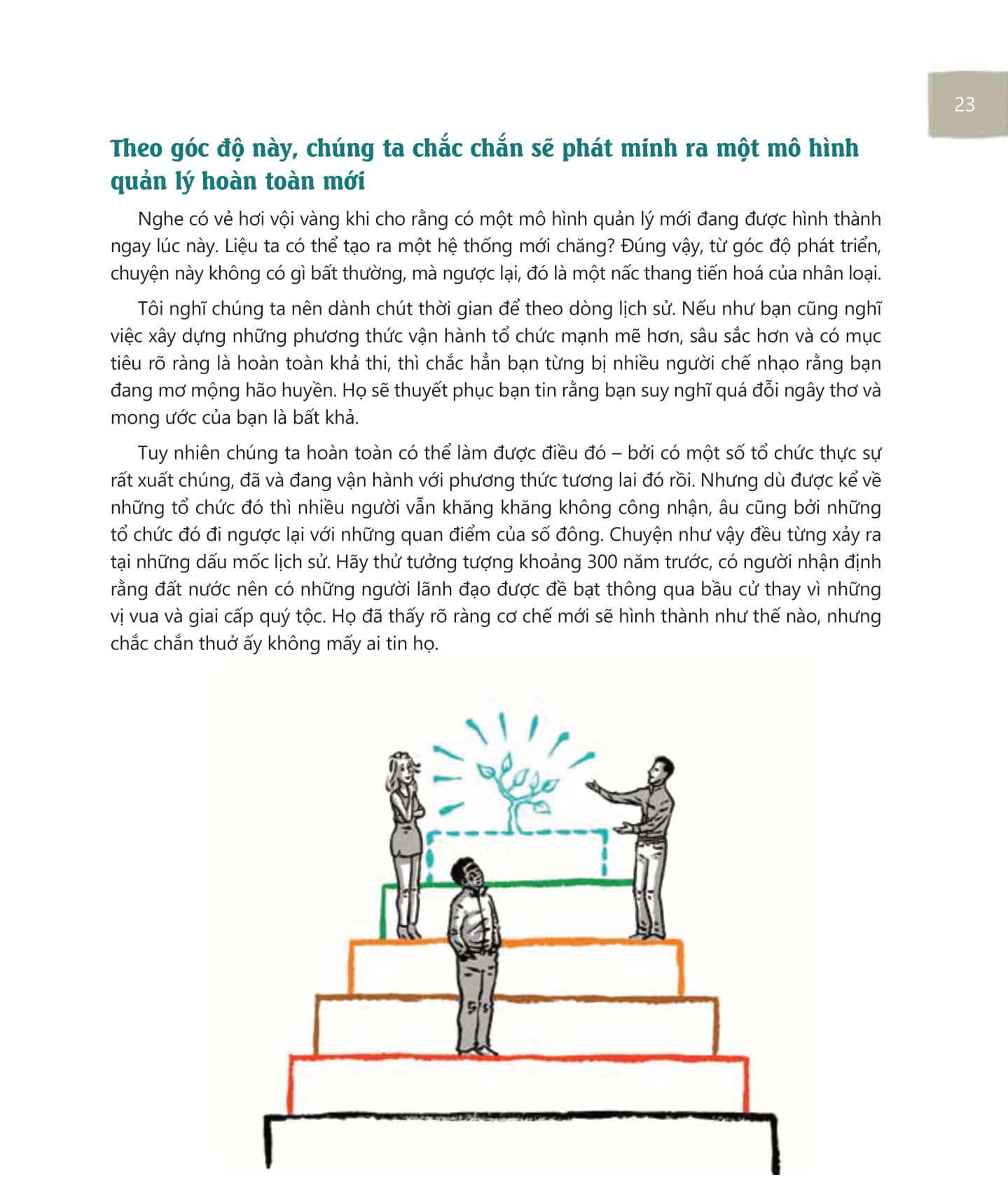 Đó là lí do chúng tôi tìm đến Tái tạo tổ chức – một cuốn sách thôi thúc chúng ta khám phá bản thân để đạt được hạnh phúc chân chính bằng cách tạo ra các mối quan hệ đích thực xung quanh mình. “Đích thực” ở đây có nghĩa là những mối quan hệ được tạo ra từ sự thấu hiểu, tin tưởng, lòng nhân ái trên nền tảng minh bạch và cân bằng. Bởi tính chủ động, phong phú và chân thành của chúng, những mối quan hệ này đôi lúc khiến ta bị tổn thương, nhưng qua những tổn thương tích cực đó, chúng ta sẽ nhanh chóng trưởng thành, sẽ cảm thấy rằng mình thực sự sống.