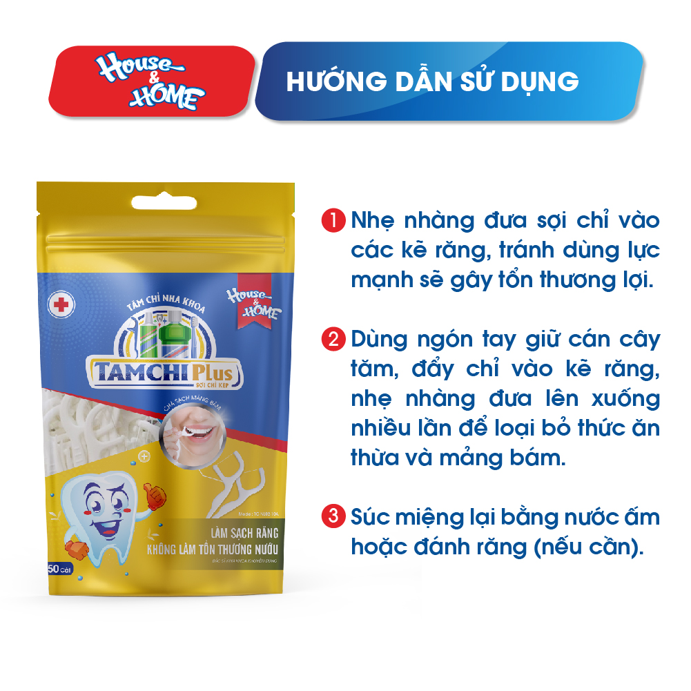 - Tên sản phẩm: Tăm chỉ nha khoa - TAMCHI Plus sợi chỉ kép - Thông tin thương hiệu: TAMCHI là nhãn hàng thuộc Công ty Cổ phần Sản xuất Gia dụng House & HOME