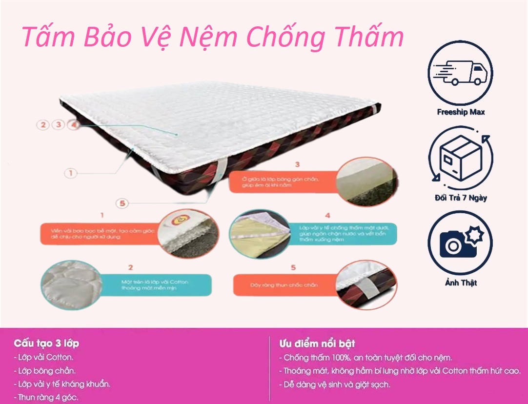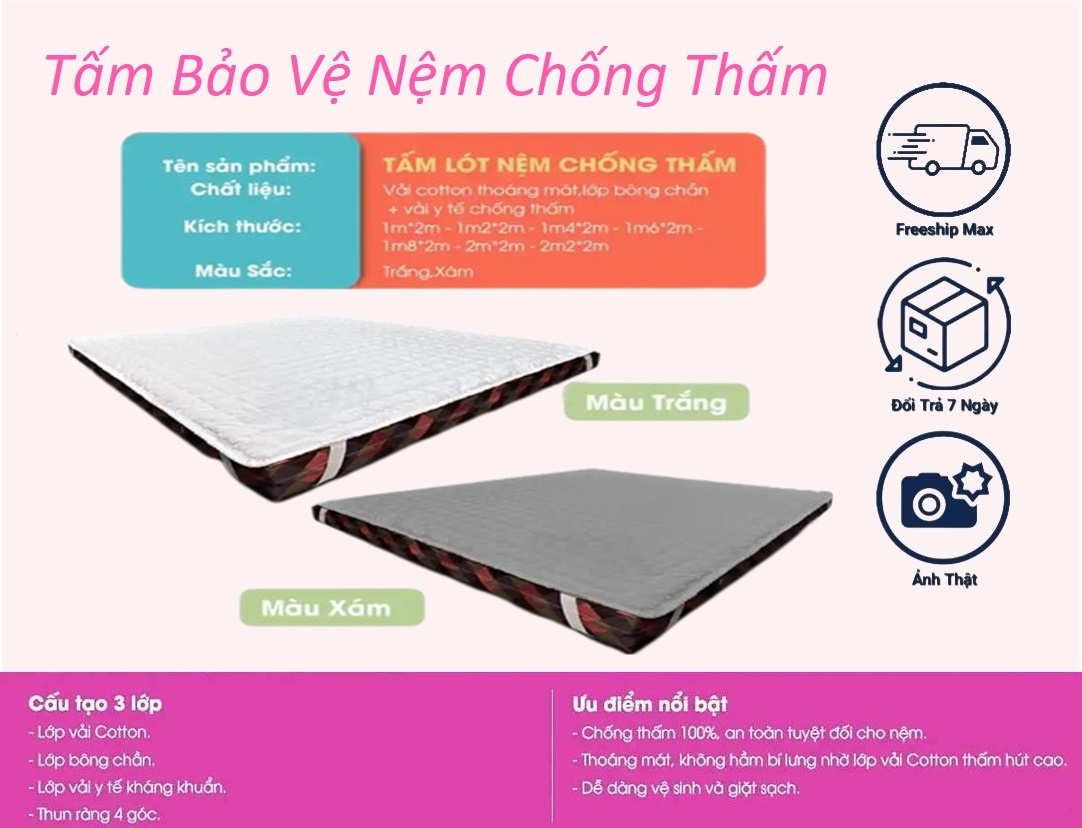 Mô tả chi tiết Lựa chọn tấm bảo vệ nệm có kích thước tương ứng với nệm. Kích thước tiêu chuẩn:1m2x2m; 1m4x2m; 1m6x2m; 1m8x2m; 2mx2m Cấu trúc 3 lớp: 2 lớp ngoài là vải Poly