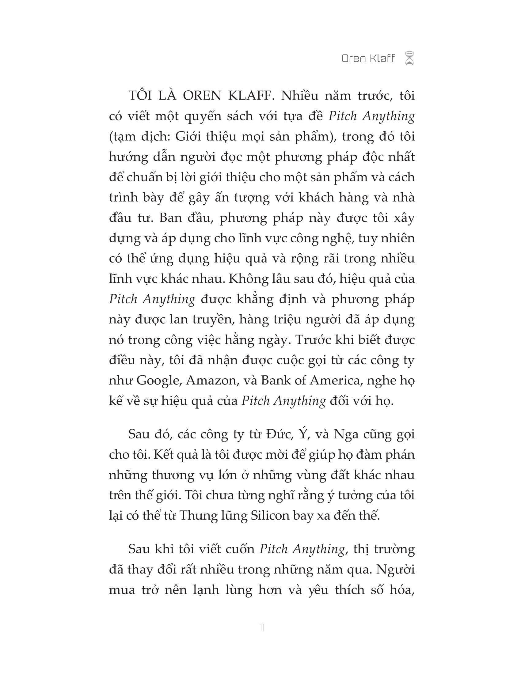 Oren Klaff là một trong những chuyên gia hàng đầu thế giới về bán hàng, huy động vốn và đàm phán. Cuốn sách đầu tiên của anh, Pitch Anything, được in hơn 1.000.000 bản trên toàn thế giới. Anh viết cho Harvard Business Review, Inc., Advertising Age, Entrepreneur và xuất hiện trên hàng trăm tạp chí, podcast và blog. Là đối tác đầu tư trong quỹ đầu tư cổ phần tư nhân trị giá 200 triệu đô la.
