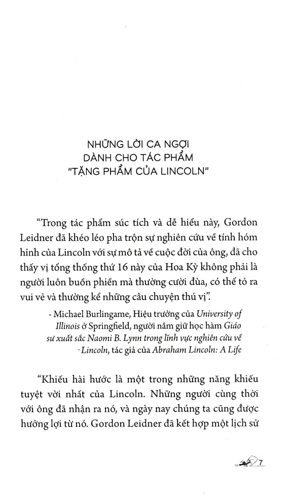 Cuốn sách Tặng Phẩm Của Lincoln của Gordon Leidner là một hành trang tuyệt vời dành cho những ai yêu thích lịch sử và đặc biệt là ngưỡng mộ Abraham Lincoln. Với phong cách viết dí dỏm và lấy cảm hứng từ những mẩu chuyện hài hước của Lincoln, Leidner không chỉ khai quật những câu chuyện thú vị về cuộc đời và sự nghiệp của tổng thống này mà còn phác họa rõ nét khiếu hài hước đặc trưng của ông.