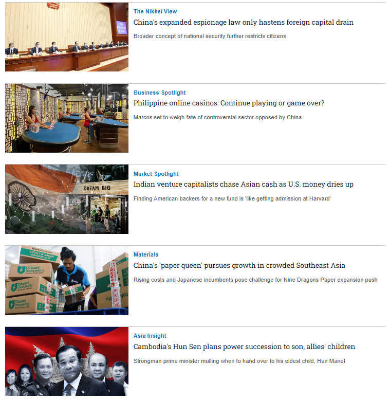 Nikkei Asia là tạp chí bằng tiếng Anh rất uy tín của Nikkei - Nhật Bản, chuyên viết về Xu hướng khu vực châu Á - Thái Bình Dương, Kinh tế, Công nghệ, Chính trị,