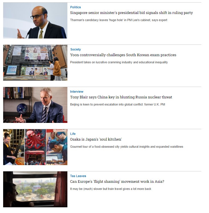 Nikkei Asia là tạp chí tiếng Anh có tên tuổi thuộc tập đoàn Nikkei - Nhật Bản, chuyên viết về những xu hướng kinh tế, công nghệ, chính trị của các nước trong khu vực châu Á - Thái Bình Dương gồm có Việt Nam. Ngoài ra còn cung cấp các phân tích từ chuyên gia, nhà báo về đời sống và văn hóa các nước châu Á. (Trending, Business, Markets,Tech, Politics, Economy, Features, Opinion, Life & Arts).