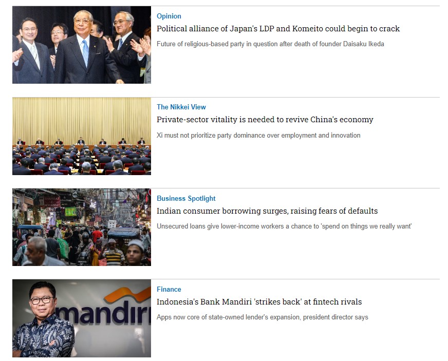 Nikkei Asia là tạp chí bằng tiếng Anh rất uy tín của Nikkei - Nhật Bản, chuyên viết về Xu hướng khu vực châu Á - Thái Bình Dương, Kinh tế, Công nghệ, Chính trị,