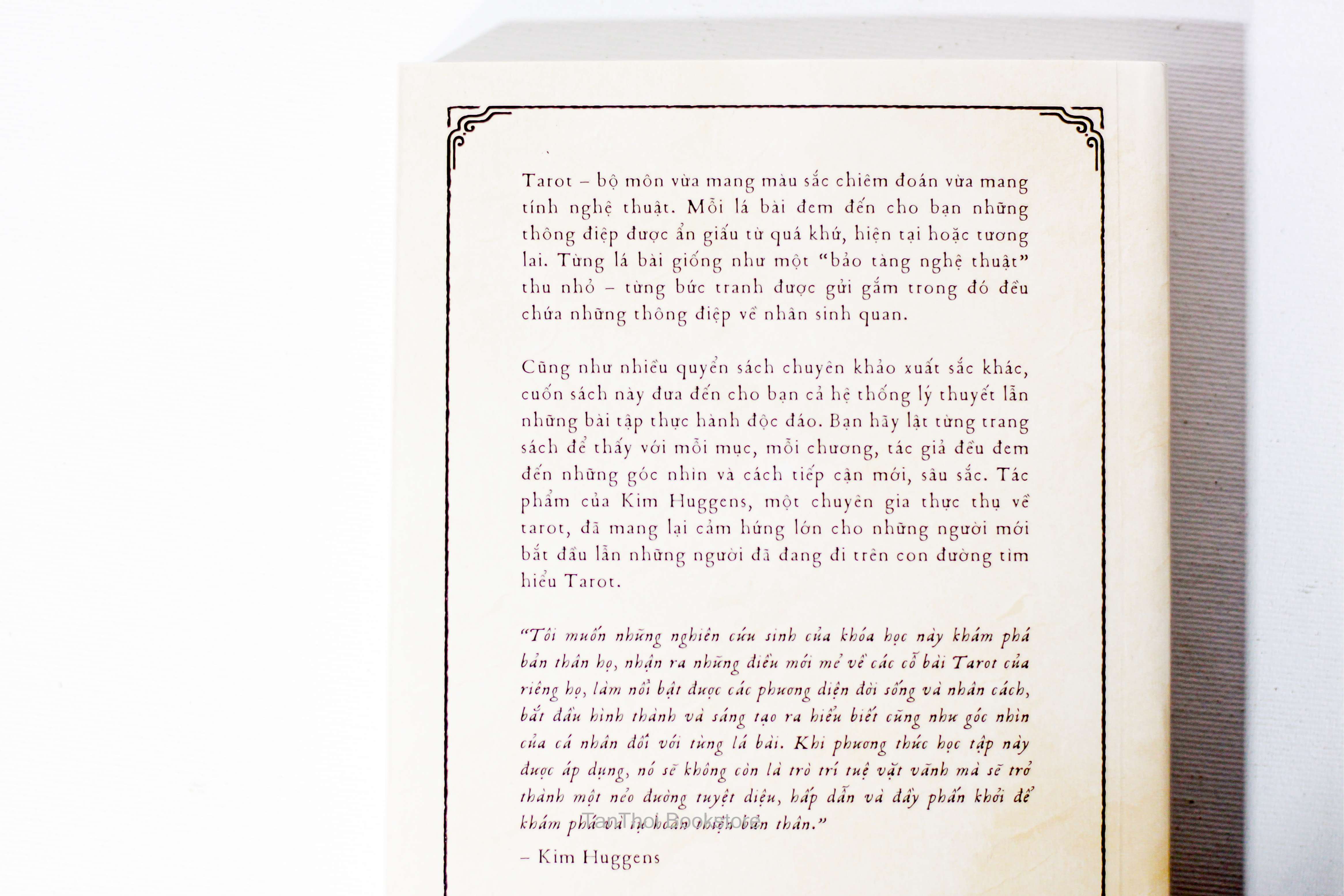 Cũng như nhiều quyển sách chuyên khảo xuất sắc khác, cuốn sách này đưa đến cho bạn cả hệ thống lý thuyết lẫn những bài tập thực hành độc đáo. Bạn hãy lật từng trang sách để thấy với mỗi một mục, mỗi một chương, tác giả đều đem đến những góc nhìn và cách tiếp cận mới, sâu sắc. Tác phẩm của Kim Huggens, một chuyên gia thực thụ về tarot, đã mang lại cảm hứng lớn cho những người mới bắt đầu lẫn những người đã đang đi trên con đường tìm hiểu Tarot.