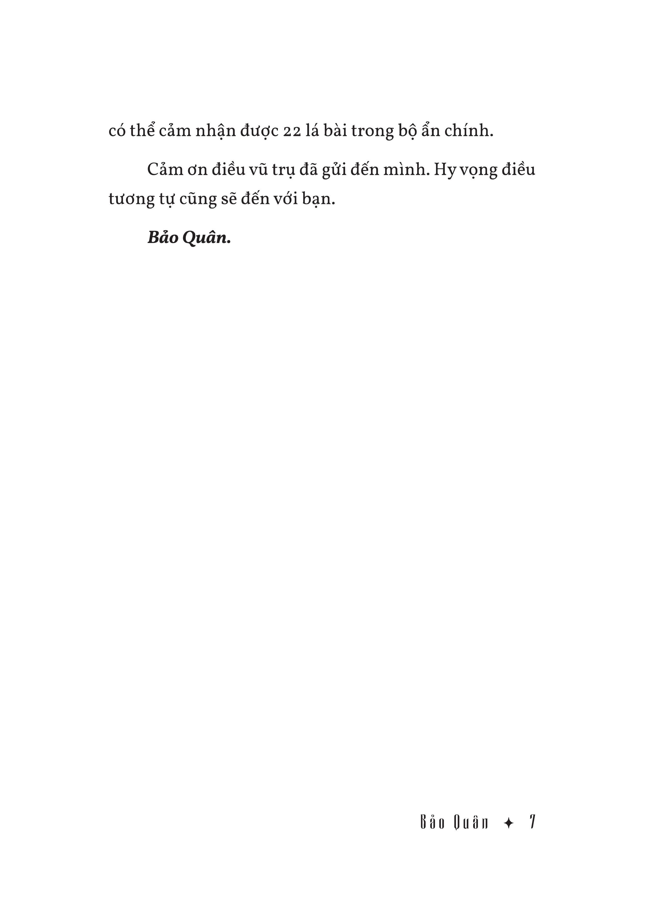 à Ánh Sáng Cũng Là Tình Yêu - Những Thông Điệp Chữa Lành Từ Tarot Giữa cuộc sống bộn bề nhiều lo âu và không tránh khỏi đau buồn, người ta có xu hướng đi tìm câu trả lời cho những khúc mắc trong lòng, cũng như tìm lời khuyên giải cho nỗi buồn chóng qua đi. Và Tarot có thể là công cụ hữu ích để làm điều đó, với các lá bài ẩn chứa thông điệp giúp chúng ta tự vấn, hiểu rõ hơn những vấn đề mình đang mắc phải. Là ánh sáng cũng là tình yêu là tản văn tập hợp những câu chuyện và thông điệp chữa lành dựa trên 78 lá bài Tarot. Mỗi lá Tarot sẽ chuyển tải thông điệp tương ứng cùng những trải nghiệm về tình yêu, gia đình, hay cuộc sống của chính tác giả với hơn 10 năm kinh nghiệm kể chuyện qua Tarot. Những khi cảm thấy rối bời, hoặc đau buồn trong một mối quan hệ thì cuốn sách này có thể là một chỉ dẫn nhỏ cho hành trình chữa lành của bạn. Bạn có thể đọc nó xuôi từ trên xuống, hoặc mở ngẫu nhiên bất kỳ trang nào. Hy vọng cuốn sách Là ánh sáng cũng là tình yêu có thể giúp người đọc soi chiếu, tìm thấy ánh sáng cho những vấn đề còn bỏ ngỏ và tình yêu trong cuộc sống chính mình. Mong rằng mỗi khi gấp cuốn sách nhỏ này lại, ưu tư trong lòng bạn được vơi bớt, để trái tim còn chỗ cho tình yêu và ánh sáng ngập tràn. “Suy cho cùng, mối quan hệ với bản thân là mối quan hệ quan trọng nhất. Bất cứ lúc nào bạn cảm thấy mất định hướng hay suy sụp vì bất kỳ kiểu thất bại nào, thì đó chính là lúc tuyệt vời để bạn quay đầu đào sâu và tìm hiểu chính mình, yêu chính mình, thêm một lần nữa.”