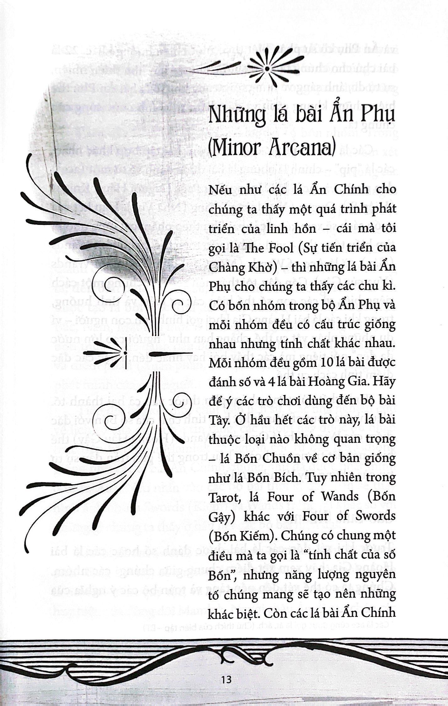 trúc giống nhau nhưng tính chất khác nhau. Mỗi nhóm đều gồm 10 lá bài được đánh số và 4 lá bài Hoàng Gia. Hãy để ý các trò chơi dùng đến bộ bài Tây. Ở hầu hết các trò này, lá bài thuộc loại nào không quan trọng – lá Bốn Chuồn về cơ bản giống như lá Bốn Bích. Tuy nhiên trong Tarot, lá Four of Wands (Bốn Gậy) khác với Four of Swords (Bốn Kiếm). Chúng có chung một điều mà ta gọi là “tính chất của số Bốn”, nhưng năng lượng nguyên tố chúng mang sẽ tạo nên những khác biệt. Còn các lá bài Ẩn Chính và Ẩn Phụ có sự phân biệt theo một chiều hướng khác. 22 lá bài chủ cho chúng ta thấy những chủ đề lớn như thiên nhiên, sự tự do, ánh sáng và bóng tối; trong khi 56 lá bài Ẩn Phụ thể hiện những khung cảnh và đặc điểm từ chính cuộc sống của chúng ta