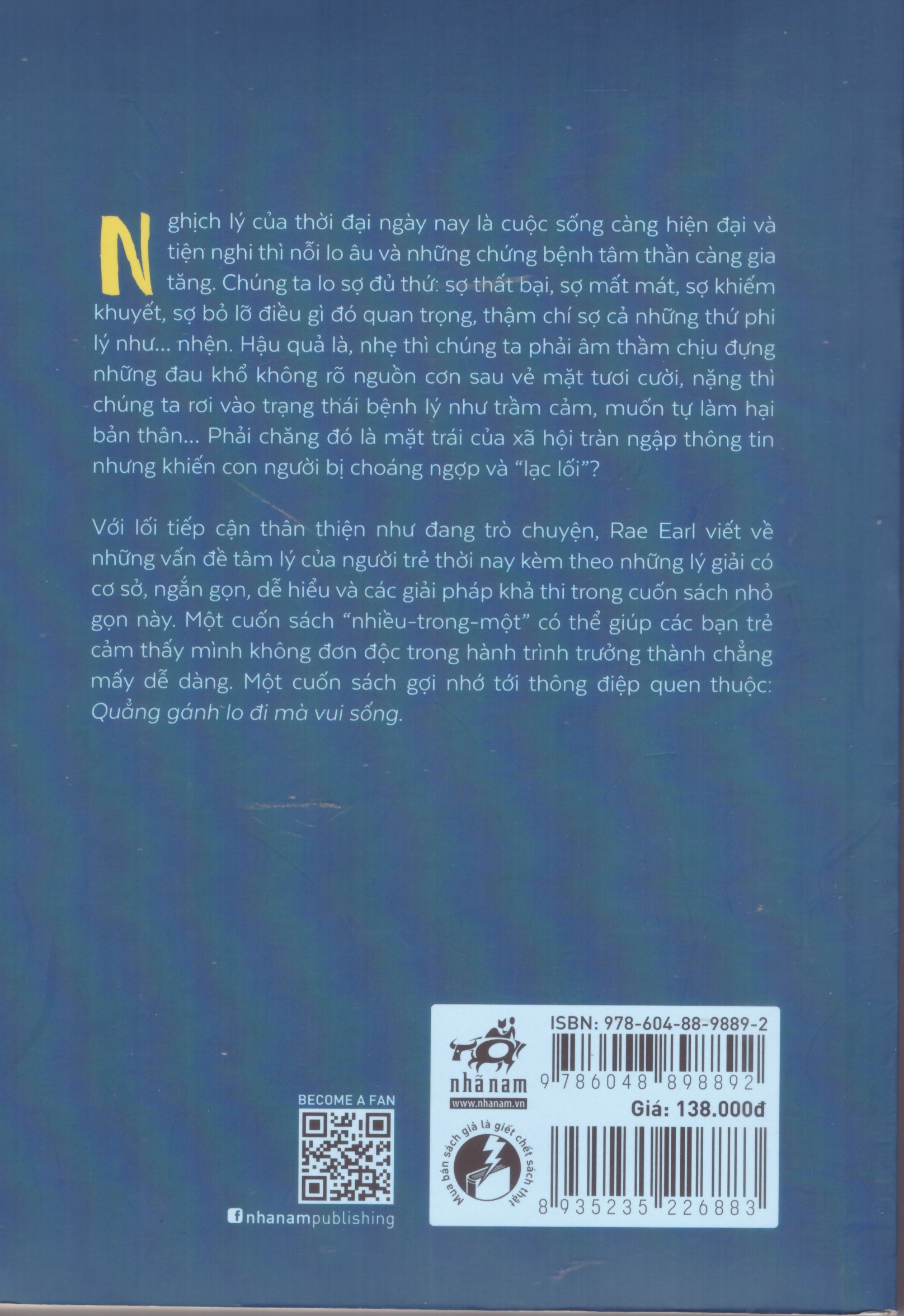 Cuốn sách viết về các bệnh lý tâm thần như trầm cảm, rối loạn ăn uống, ám ảnh cưỡng chế, sợ hãi phi lý, hoang tưởng… thường gặp ở những người trẻ đang trong quá trình trưởng thành và phải đối mặt với những thử thách của cuộc sống và các giải pháp để đương đầu, khắc phục và chung sống với chúng. Nghịch lý của thời đại ngày nay là cuộc sống càng hiện đại và tiện nghi thì nỗi lo âu và những chứng bệnh tâm thần càng gia tăng. Chúng ta lo sợ đủ thứ: sợ thất bại, sợ mất mát, sợ khiếm khuyết, sợ bỏ lỡ điều gì đó quan trọng, thậm chí sợ cả những thứ phi lý như… nhện. Hậu quả là, nhẹ thì chúng ta phải âm thầm chịu đựng những đau khổ không rõ nguồn cơn sau vẻ mặt tươi cười, nặng thì chúng ta rơi vào trạng thái bệnh lý như trầm cảm, muốn tự làm hại bản thân… Phải chăng đó là mặt trái của xã hội tràn ngập thông tin nhưng khiến con người bị choáng ngợp và “lạc lối”? Với lối tiếp cận thân thiện như đang trò chuyện, Rae Earl viết về những vấn đề tâm lý của người trẻ thời nay kèm theo những lý giải có cơ sở, ngắn gọn, dễ hiểu và các giải pháp khả thi trong cuốn sách nhỏ gọn này. Một cuốn sách “nhiều-trong-một” có thể giúp các bạn trẻ cảm thấy mình không đơn độc trong hành trình trưởng thành chẳng mấy dễ dàng. Một cuốn sách gợi nhớ tới thông điệp: Quẳng gánh lo đi mà vui sống.