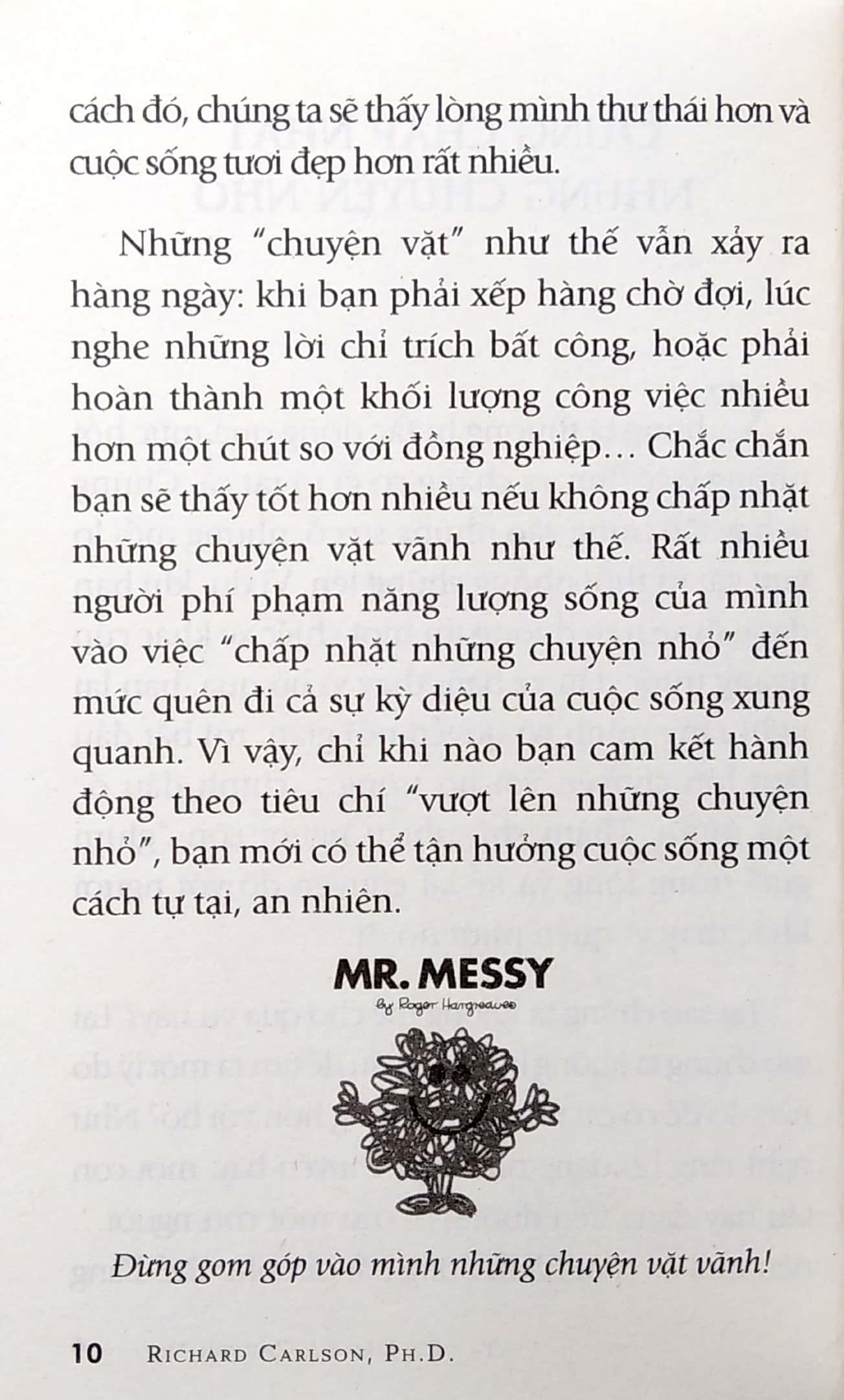 Cuốn sách trình bày các bí quyết đơn giản, nhưng hiệu quả và đóng vai trò dẫn đường cho bạn đến quan điểm sống tốt hơn cũng như một cách sống thư thái hơn. Bạn sẽ nhận thấy có nhiều bí quyết không chỉ áp dụng cho vài sự việc nhỏ nhất định mà còn cho nhiều thách thức lớn hơn của cuộc sống. Khi bạn không chấp nhặt những chuyện nhỏ, cuộc sống của bạn không phải ngay lập tức trở nên hoàn hảo, nhưng bạn sẽ học được cách chấp nhận những điều tự nhiên đang diễn ra xung quanh bạn.