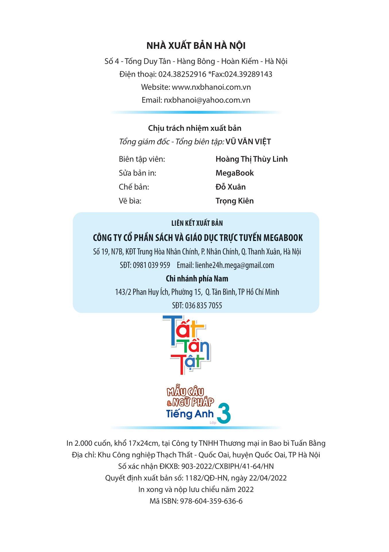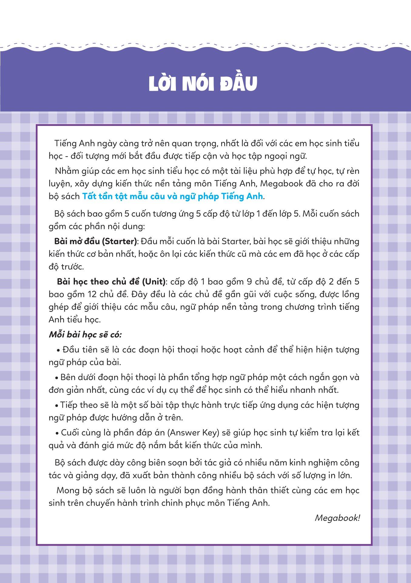 Tiếng Anh ngày càng trở nên quan trọng, nhất là đối với các em học sinh tiểu học - đối tượng mới bắt đầu được tiếp cận và học tập ngoại ngữ. Nhằm giúp các em học sinh tiểu học có một tài liệu phù hợp để tự học, tự rèn luyện, xây dựng kiến thức nền tảng môn Tiếng Anh, bộ sách Tất tần tật mẫu câu và ngữ pháp Tiếng Anh đã ra đời.