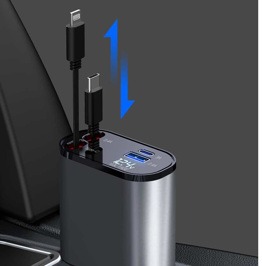 Tẩu Sạc Nhanh Xe Ô Tô TÍCH HỢP DÂY Sạc Type C, Lightning 100W | Hiển Thị Thông Số Sạc, Dây Rút Chống Rối, 4in1 Thuận tiện: Bộ sạc ô tô USB này có thiết kế nhỏ gọn, nâng cao vẻ ngoài của nội thất ô tô của bạn. Nói lời tạm biệt với những sợi dây lộn xộn và tận hưởng vẻ ngoài sạch sẽ, gọn gàng hơn khi sạc các thiết bị của bạn ở ngoài.    Sạc nhanh: Bộ sạc có thể sạc đồng thời 4 thiết bị với tốc độ nhanh, với công suất tối đa 2,4A/12W cho mỗi cổng. Tổng công suất 4,8A đảm bảo sạc hiệu quả cho cả điện thoại và máy tính bảng.    Quản lý cáp theo phong cách: Giữ cho ô tô của bạn sạch sẽ và gọn gàng với hệ thống cáp có thể thu vào. Cáp không vướng víu kéo dài trơn tru lên đến 80cm và tự động thu trở lại. Thiết kế linh hoạt của nó có thể mở rộng để dễ dàng đáp ứng mọi yêu cầu sạc của bạn.    An toàn: hỗ trợ sạc nhanh giao thức đầy đủ cho các nhãn hiệu thiết bị khác nhau. Nó có thể sạc các thiết bị của bạn một cách nhanh chóng và hiệu quả để đáp ứng nhu cầu hàng ngày của bạn.    Khả năng tương thích phổ quát: Bộ sạc ô tô USB đa năng này hoàn hảo cho nhiều kiểu xe, từ ô tô nhỏ đến xe tải và SUV, đồng thời tương thích với các kiểu xe phổ thông có điện áp lái xe từ 12V đến 24V, đảm bảo khả năng tương thích với nhiều loại xe.  Trải nghiệm khả năng sạc nhanh như chớp khi đang di chuyển với bộ sạc nhỏ gọn dành cho ô tô và xe tải này. Nó tự động rút lại để tạo sự thuận tiện tối đa và có thể cung cấp một giao thức sạc nhanh đầy đủ với công suất tối đa lên đến 2.4A/12W. Nói lời tạm biệt với pin chết trên đường!   Thông số kỹ thuật: Chất liệu: ABS + PC Màu sắc: bạc Trọng lượng: khoảng 100g Điện áp: 10-30V Đầu ra: tối đa 100W Kích thước: khoảng 139 65 34,5mm Chiều dài mở rộng cáp sạc: 800 +/- 30mm