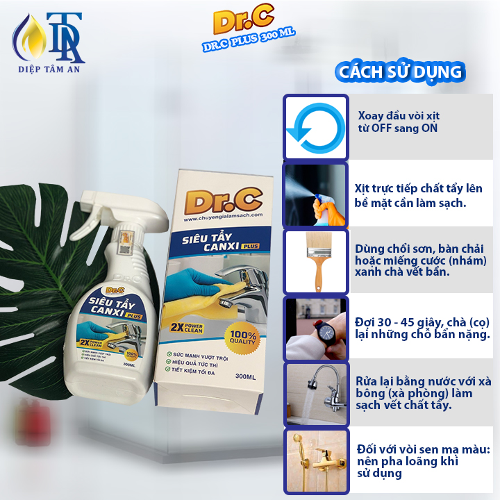 *CÔNG DỤNG:Tẩy Cặn Canxi Nhà Tắm,Tẩy Vách Kính Vòi Sen Inox,Tẩy Ố Vàng Nhà Vệ Sinh Lavabo- Plus Dr.C 300ml: - Tẩy cặn canxi nhà tắm : Ố mốc vẩy cá, đốm trắng cặn canxi bám trên vòi sen inox, cabin, vách kính, bồn rửa mặt,bồn tắm, thiết bị phòng tắm và bồn rửa bát Inox 304 trở lên
