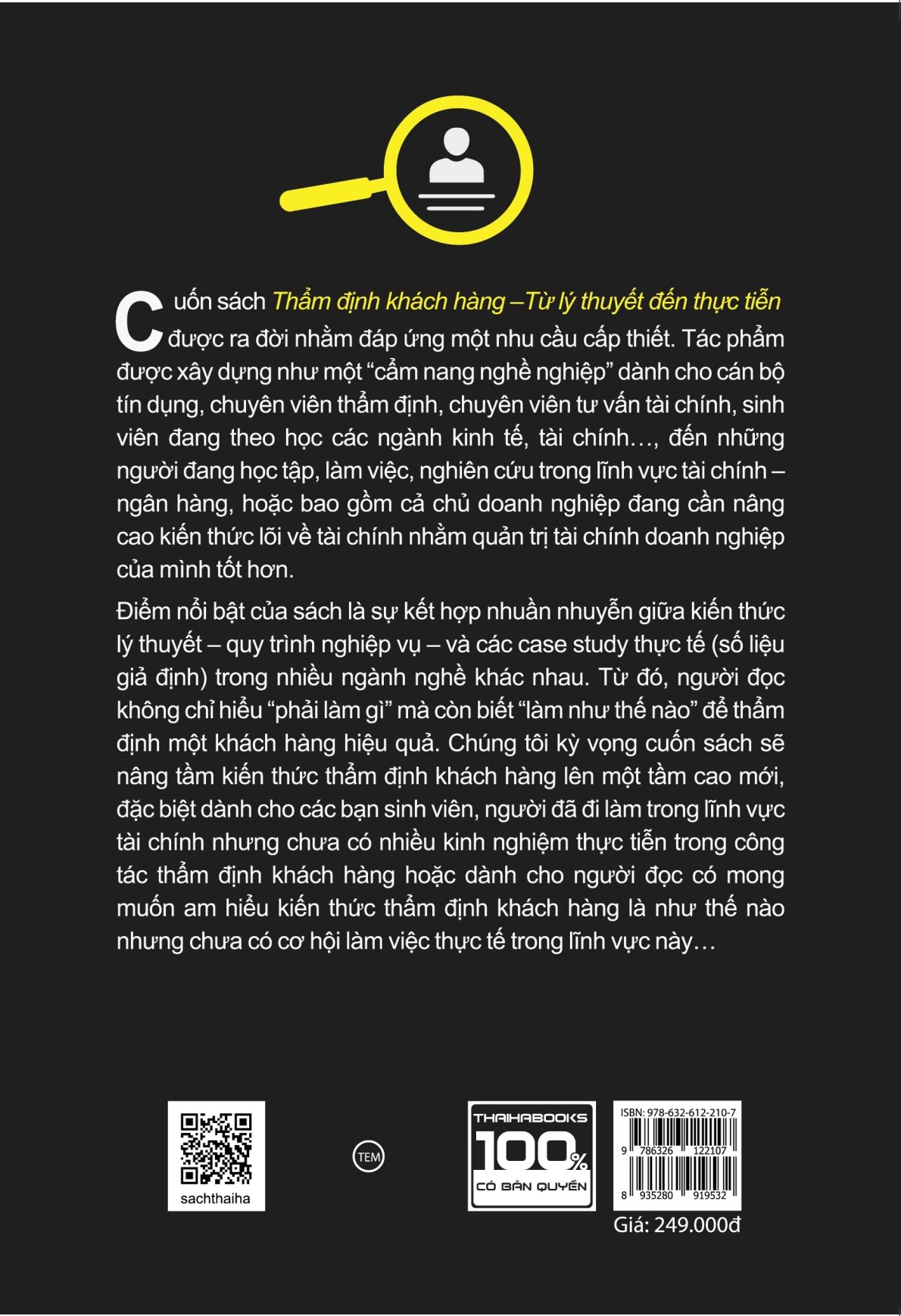Cuốn sách “Thẩm định khách hàng – Từ lý thuyết đến thực tiễn” được ra đời nhằm đáp ứng cho nhu cầu cấp thiết trên. Tác phẩm được xây dựng như một “cẩm nang nghề nghiệp” dành cho cán bộ tín dụng, chuyên viên thẩm định, chuyên viên tư vấn tài chính, sinh viên đang theo học các ngành kinh tế, tài chính… cho những người đang học tập, làm việc, nghiên cứu trong lĩnh vực tài chính – ngân hàng, hoặc bao gồm cả chủ doanh nghiệp đang cần nâng cao kiến thức lõi về tài chính nhằm quản trị tài chính doanh nghiệp của mình tốt hơn.