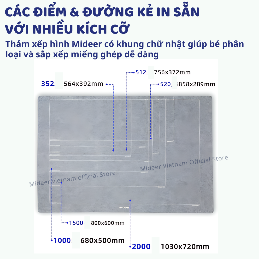 - CÁC ĐIỂM & ĐƯỜNG KẺ IN SẴN VỚI NHIỀU KÍCH CỠ Thảm xếp hình Mideer được thiết kế các khung chữ nhật với kích cỡ khác nhau giúp con dễ dàng phân loại và sắp xếp miếng ghép một cách khoa học.
