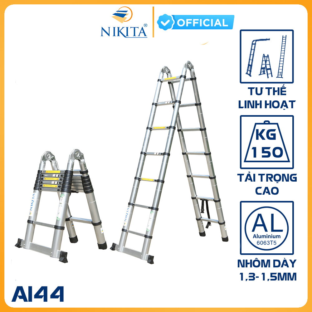 Thang nhôm rút NIKITA: có thể được điều chỉnh chiều cao một cách linh hoạt, phù hợp với nhiều nhu cầu sử dụng khác nhau. Chiều cao thang có thể lên tới 6m, đáp ứng được các công việc đòi hỏi độ cao lớn.