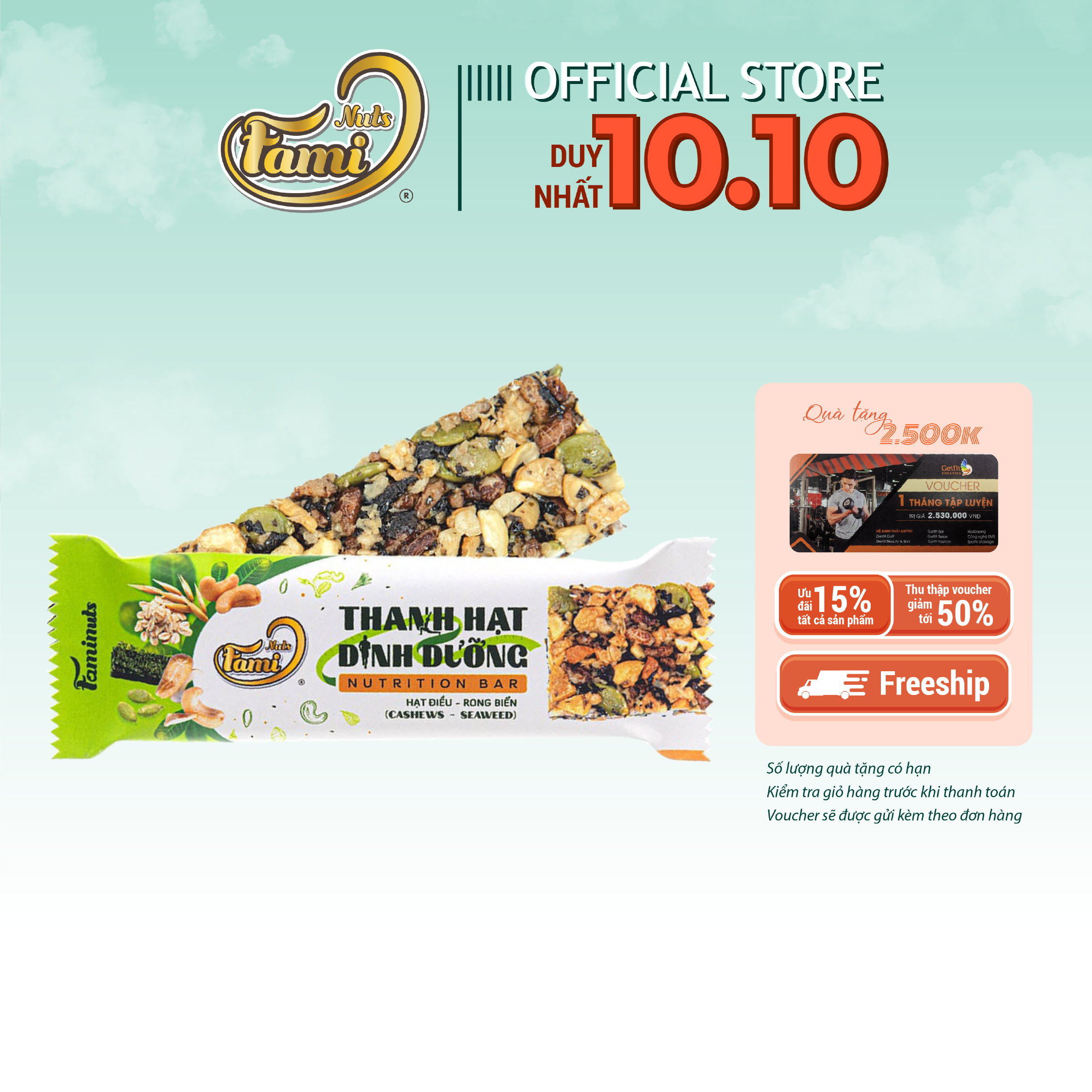 Mua tại TiktokTHÔNG TIN SẢN PHẨM THANH HẠT DINH DƯỠNG VỊ HẠT ĐIỀU & RONG BIỂN FAMINUTS Thanh hạt dinh dưỡng ít calo - bữa ăn sáng tiện lợi Đa dạng sự lựa chọn với nhiều hương vị Thành phần: Kết hợp nhiều loại hạt dinh dưỡng