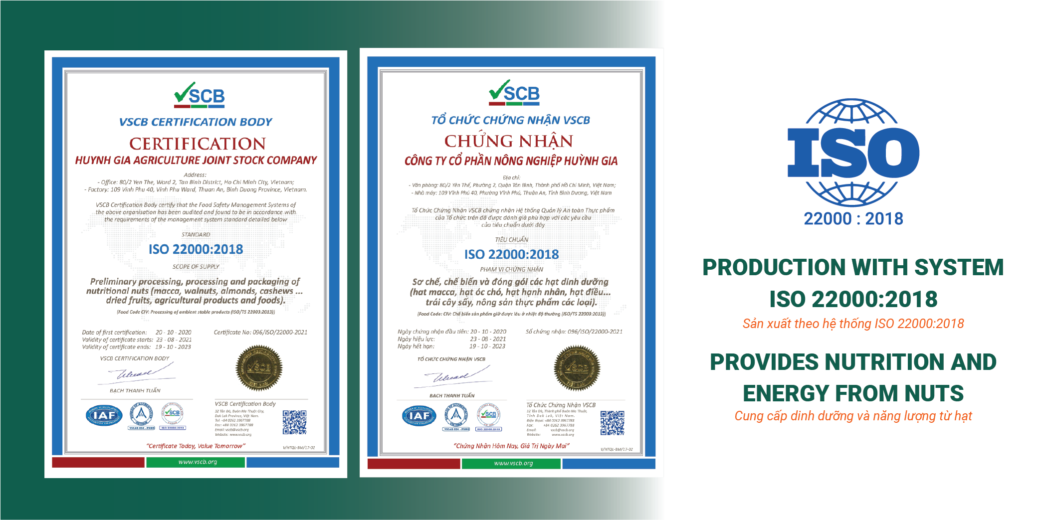 Tất cả nguyên liệu đầu vào được chọn lọc theo tiêu chuẩn khắt khe và được sản xuất tại nhà máy đạt tiêu chuẩn quốc tế HACCP, ISO 22000:2018.