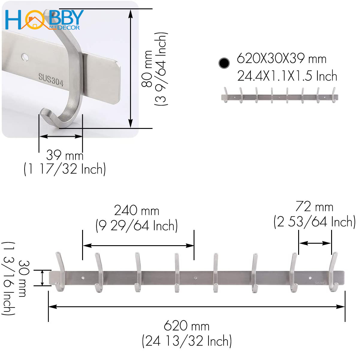 ✨Thanh treo quần áo 8 chấu inox 304 mẫu khoan Hobby Home Decor 8TV137