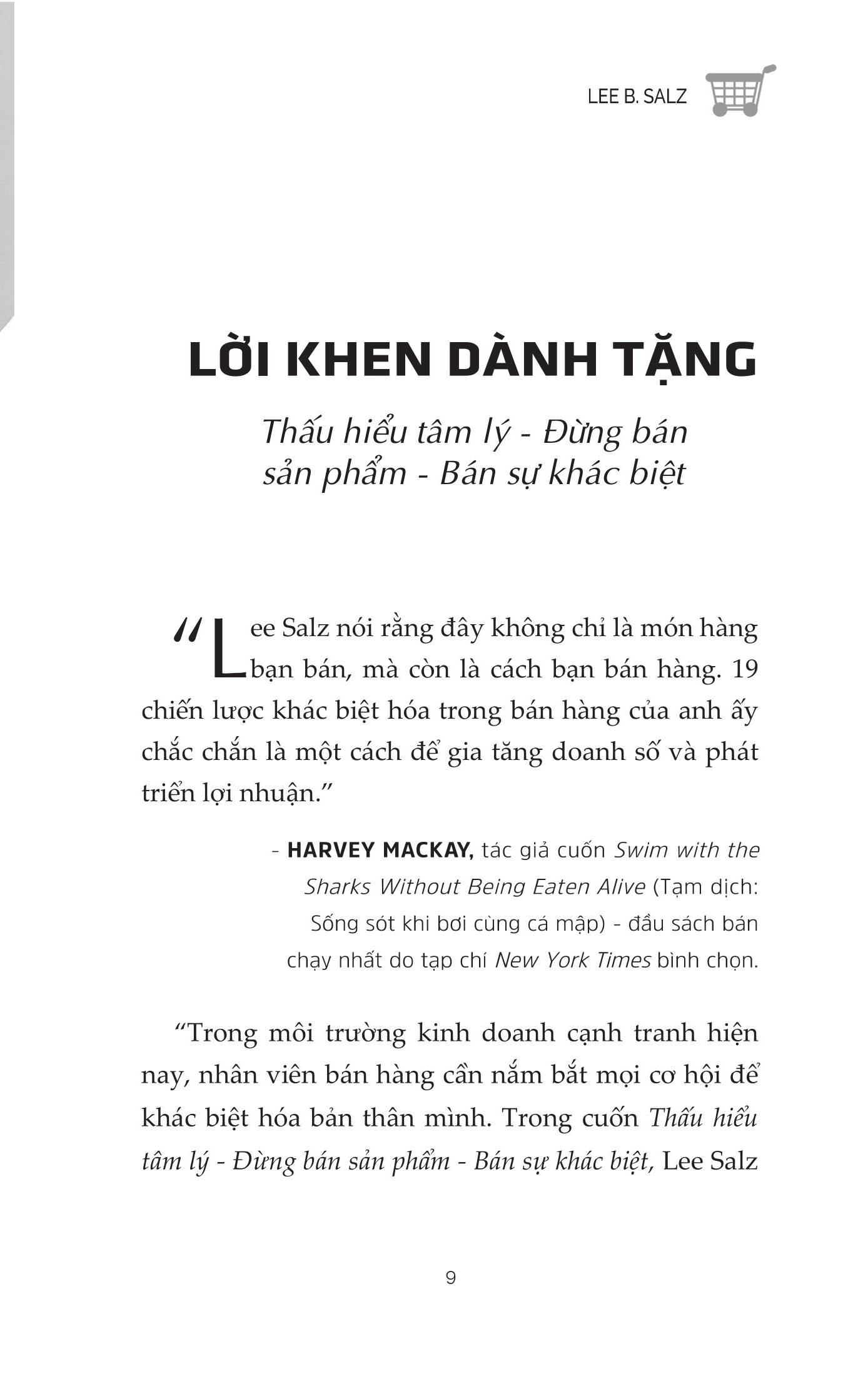Trong cuốn sách này, chiến lược gia quản lý bán hàng, Lee B. Salz trình bày 19 khái niệm dễ thực hiện để giúp nhân viên bán hàng giành được hợp đồng trong khi vẫn bảo vệ lợi nhuận. Những khái niệm này áp dụng cho bất kỳ nhân viên bán hàng nào trong bất kỳ ngành nào và dựa trên nền tảng rằng, mấu chốt là cách bạn bán, chứ không chỉ là những gì bạn bán, hãy tạo nên sự khác biệt cho bạn.