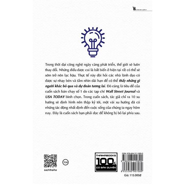 [ThaiHaBooks] Trong thời đại công nghệ ngày càng phát triển, thế giới sẽ luôn thay đổi. Những điều được coi là bất biến ở hiện tại rất có thể sẽ sớm trở nên lạc hậu. Thực tế này đòi hỏi các nhà lãnh đạo phải có sự nhạy bén và tầm nhìn dài hạn để có thể thấy những gì người khác bỏ qua và dự đoán tương lai cho sự phát triển doanh nghiệp của mình. Đó cũng là tiêu đề của cuốn sách bán chạy số 1 do các tạp chí Wall Street Journal và USA TODAY bình chọn.