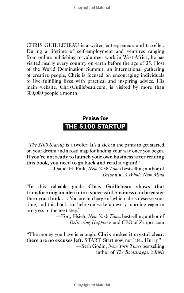 Change your job to change your life You no longer need to work nine-to-five in a big company to pay the mortgage, send your kids to school and afford that yearly holiday. You can quit the rat race and start up on your own - and you don't need an MBA or a huge investment to do it. The $100 Startup is your manual to a new way of living.