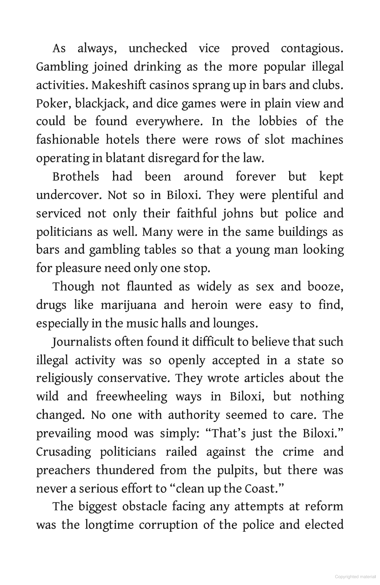 For most of the last hundred years, Biloxi was known for its beaches, resorts, and seafood industry. But it had a darker side. It was also notorious for corruption and vice, everything from gambling, prostitution, bootleg liquor, and drugs to contract killings. The vice was controlled by small cabal of mobsters, many of them rumored to be members of the Dixie Mafia.