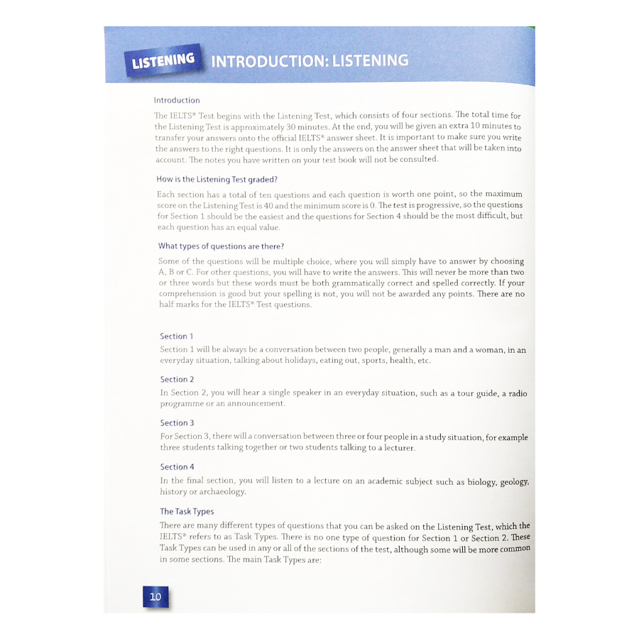 Cuốn sách giúp người học định hướng và làm quen với từng dạng bài của của từng kỹ năng trong một bài thi IELTS. Bên cạnh việc phân tích định dạng bài thi, cuốn