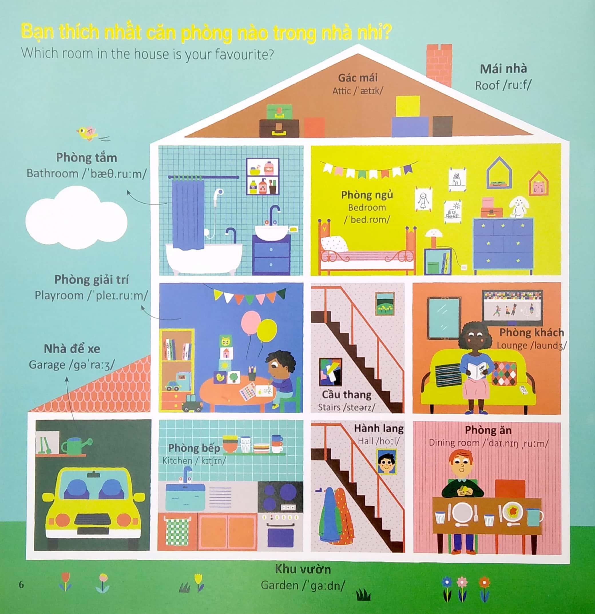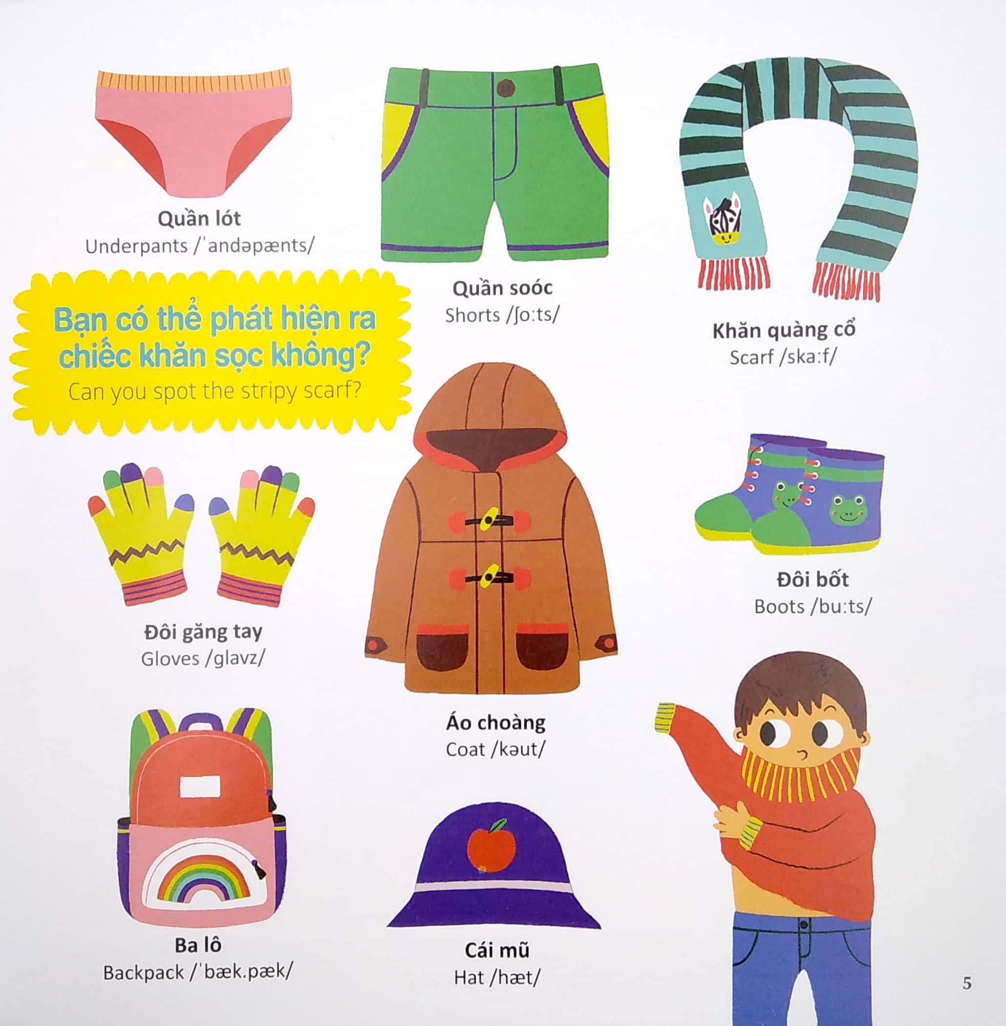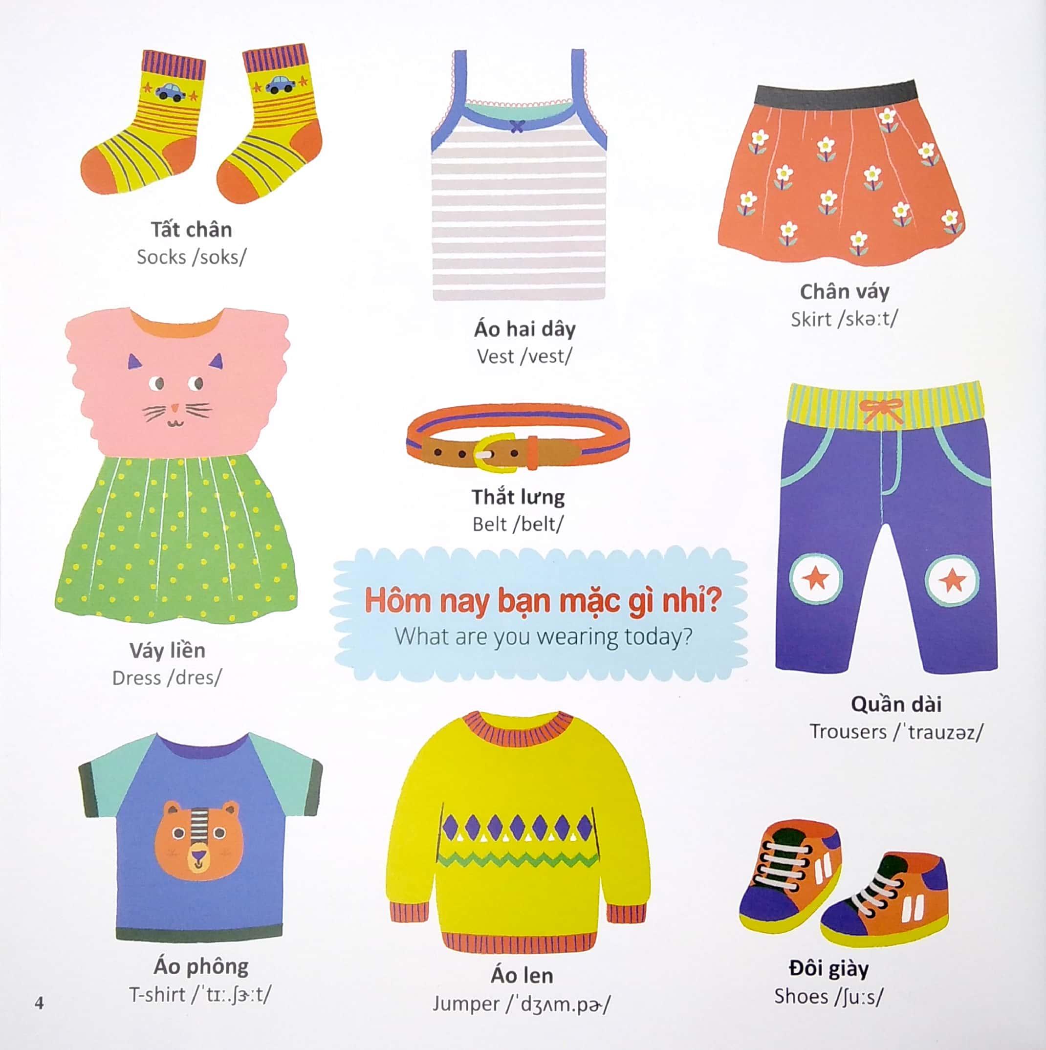 Còn gì tuyệt vời hơn khi vừa được khám phá thế giới muôn màu, vừa được trau dồi cho mình một vốn từ vựng tiếng Anh phong phú nhỉ! Với hàng trăm từ vựng song ngữ thuộc nhiều chủ đề quen thuộc như trang phục, động vật, phương tiện giao thông, nhà ở…ố mẹ và bé tha hồ được “ngụp lặn” trong thế giới ngôn từ sinh động rực rỡ của cuốn sách này. Và đây sẽ là nền tảng vững chắc giúp bé gặt hái thành công trên con đường chinh phục môn học tiếng Anh sau này đấy.
