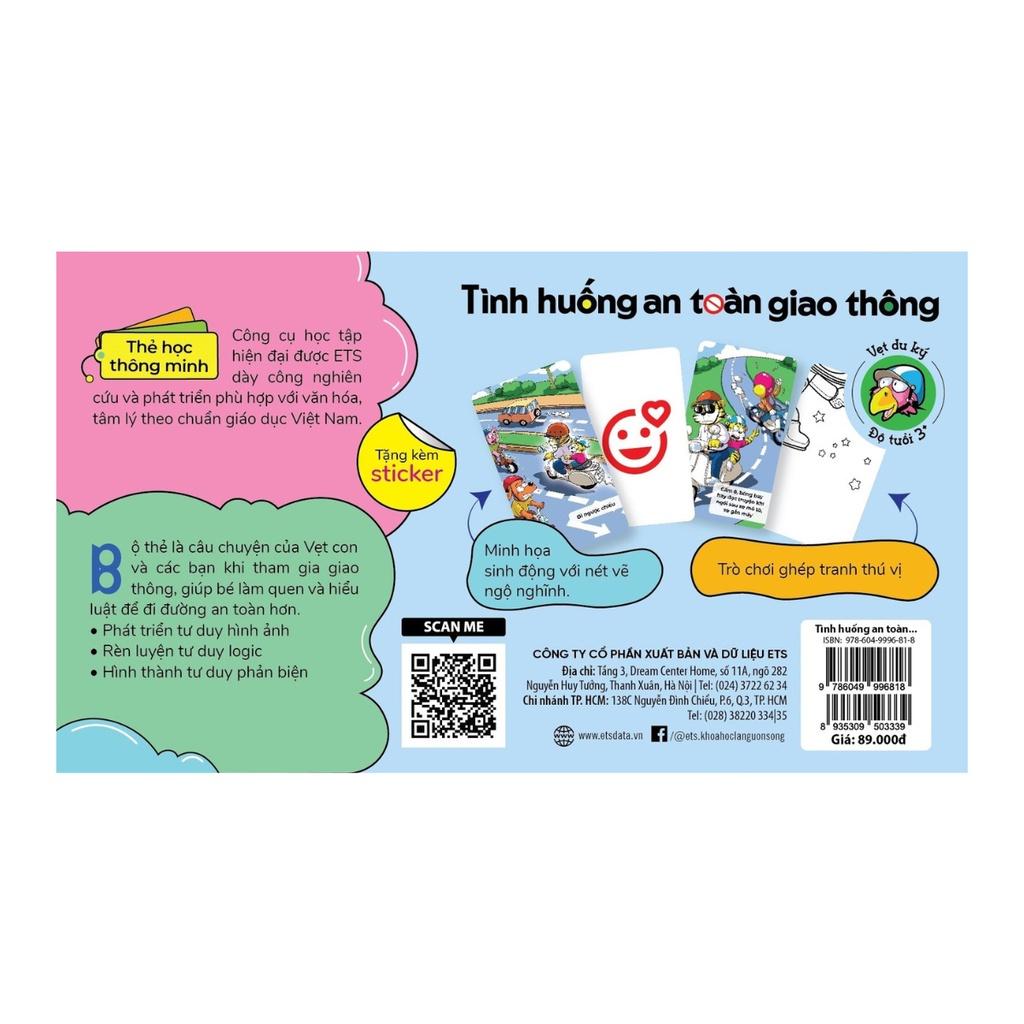 Mặt trước là 30 thẻ tình huống vui nhộn và gần gũi, đề cập đến những tình huống thường gặp nhất khi bé tham gia giao thông. Với sự hỗ trợ của 2 thẻ trợ giúp, bé thỏa thích khám phá để nhận biết và phân biệt tình huống đúng – sai qua hình minh họa sinh động và ghi chú chi tiết trên từng thẻ.