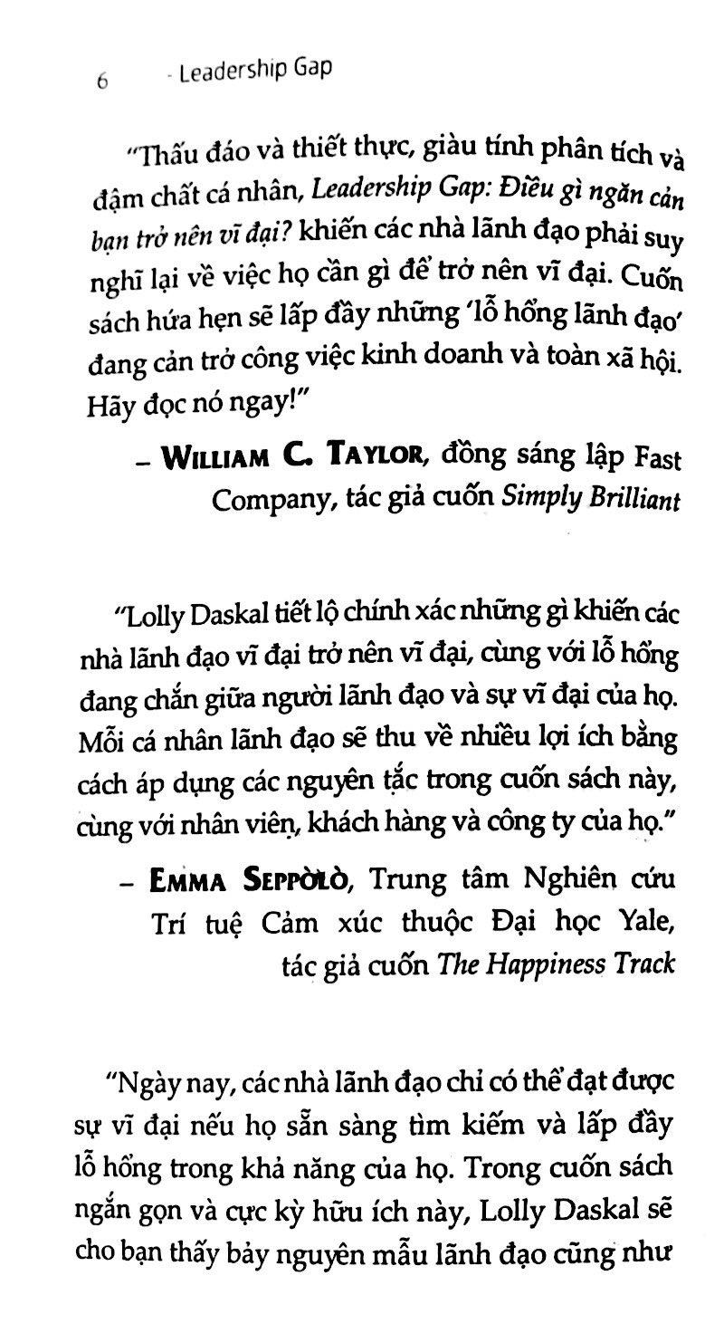 Trong cuốn sách The Leadership Gap - Điều Gì Ngăn Cản Bạn Trở Nên Vĩ Đại, Daskal giải thích tường tận cho độc giả vì sao mỗi nhà lãnh đạo đều tiềm ẩn những tố chất để trở nên vĩ đại. Mô hình lãnh đạo cô cung cấp có thể được áp dụng cho các nhà lãnh đạo ở mọi cấp bậc để cải thiện đáng kể kết quả hoạt động Nó bắt đầu bằng việc xác định hình mẫu người lãnh đạo lý tưởng của bạn và nhìn nhận những khuyết điểm của người đó. Đọc tác phẩm này, bạn sẽ có được cái nhìn hoàn toàn mới mẻ về những điều cần làm, cần suy nghĩ để thực sự trở thành nhà lãnh đạo bạn hằng mong muốn.
