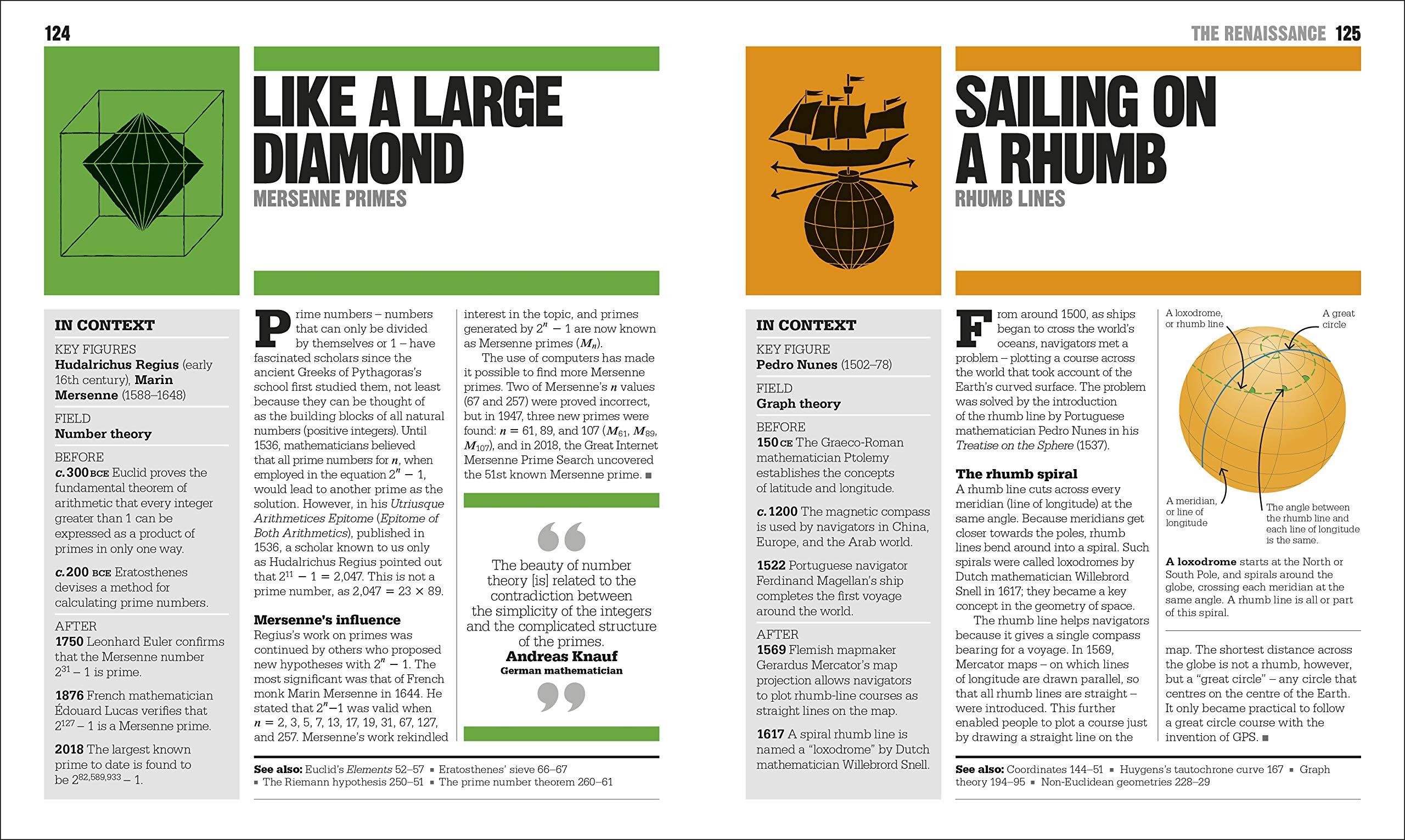 A vibrant exploration of the world's most famous and important mathematical ideas, theorems, and movements, and the great minds behind them.Take a journey through the intriguing story of numbers, patterns, and shapes in order to better understand the complex world we live in. Charting the development of maths around the world from Babylon to Bletchley Park, The Maths Book explores and explains more than 85 of the most complex and fascinating mathematical subjects. This diverse and inclusive account of mathematics will have something for everybody. It examines the maths behind world economies, secret spies, and modern technology such as computers, the internet, and AI. But it also traces the history of maths, from the mathematical ideas and inventions of the ancient world such as the first number systems, magic squares, and the Chinese abacus, through the discovery of zero and Fermat's last theorem, to the rise of group theory in the 19th century. Continuing the "Big Ideas" series' trademark combination of authoritative, clear text and bold graphics, The Maths Book uses an innovative visual approach to make the subject accessible to everyone, casual readers and students alike .