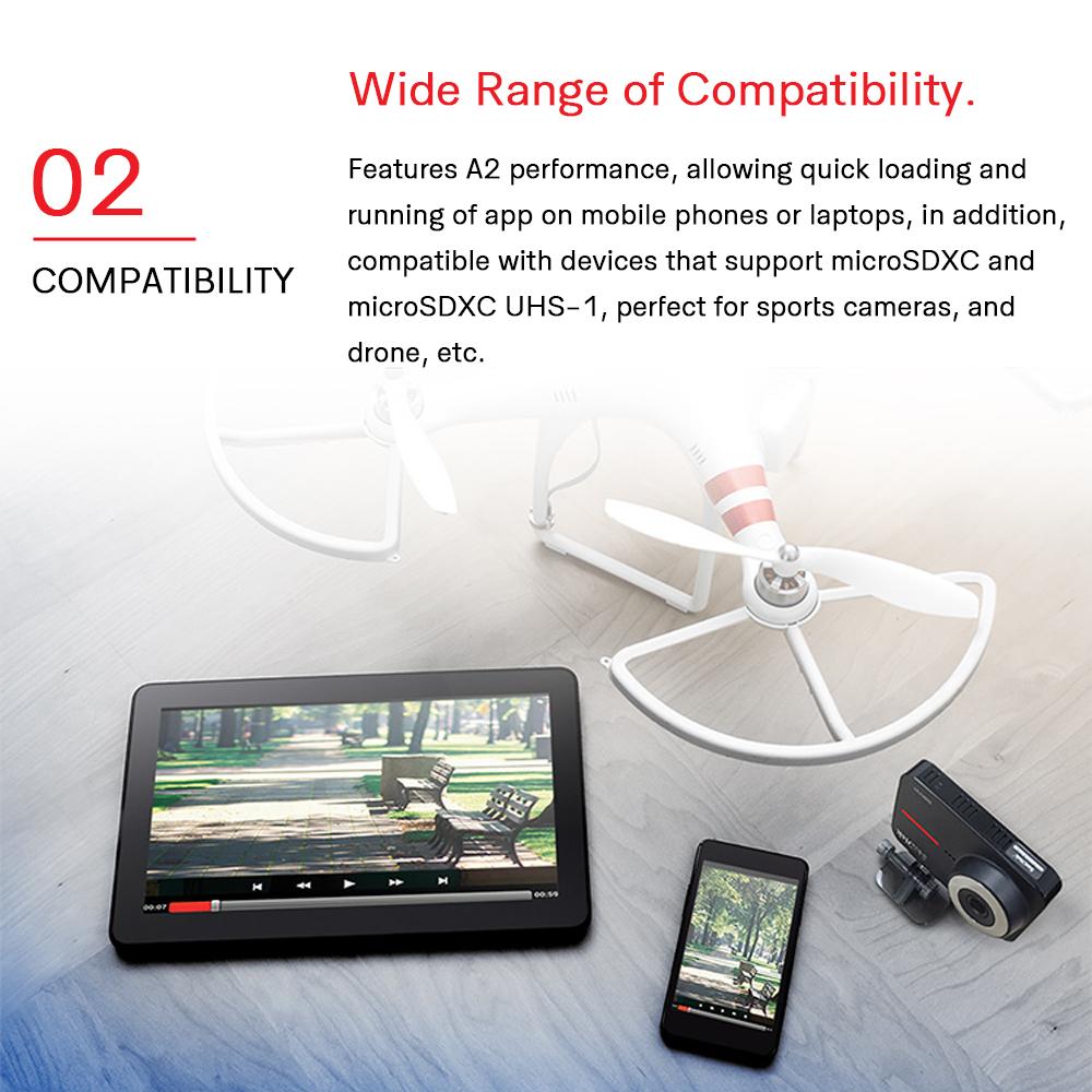 Features A2 performance, allowing quick loading and running of app on mobile phones or laptops, in addition, compatible with devices that support microSDXC and microSDXC UHS-1 or microSDHC, perfect for sports cameras, and drone, etc.