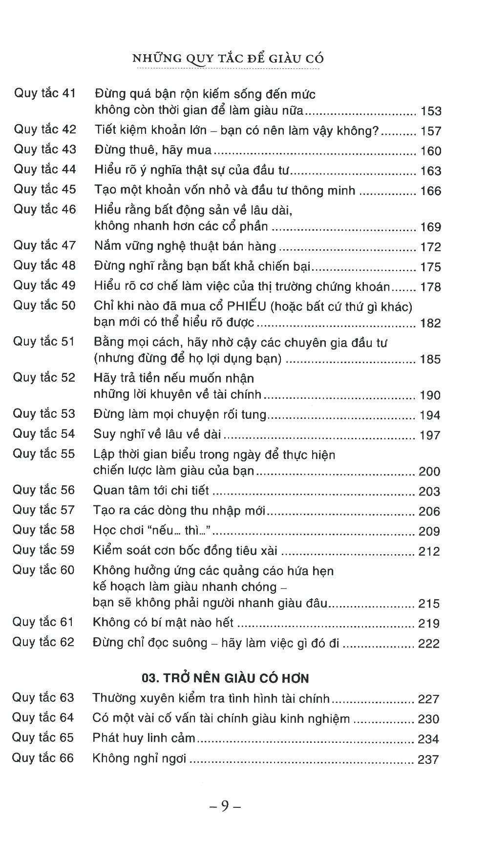 Giống như khi đi tìm kho báu, để khởi đầu hành trình đến đích giàu có, bạn cũng cần một tấm bản đồ chi tiết, chính xác. Những quy tắc để giàu có của tác giả Richard Templar chính là tấm bản đồ như thế. Trong cuốn sách này, Richard Templar sẽ dẫn dắt các bạn bắt đầu với suy nghĩ Giàu có để trở nên giàu có và giàu có hơn nữa rồi chia sẻ giàu có. Những quy tắc thiết thực, hữu ích, được đúc kết từ kinh nghiệm của rất nhiều người mà tác giả đưa ra sẽ giúp bạn ngày càng tiến gần đến đích. Hãy đọc, nghiền ngẫm kỹ từng quy tắc, và quan trọng nhất là hãy áp dụng chúng, bạn sẽ thấy điều kì diệu xảy ra.