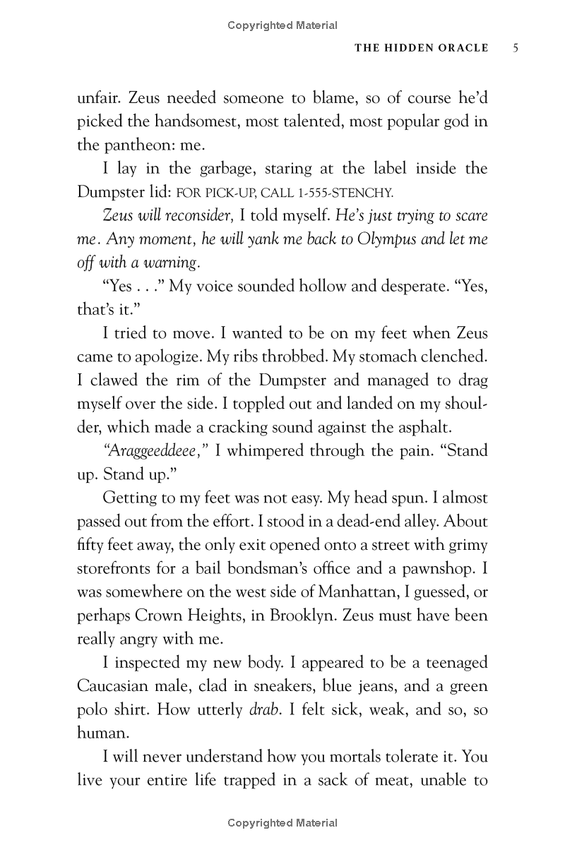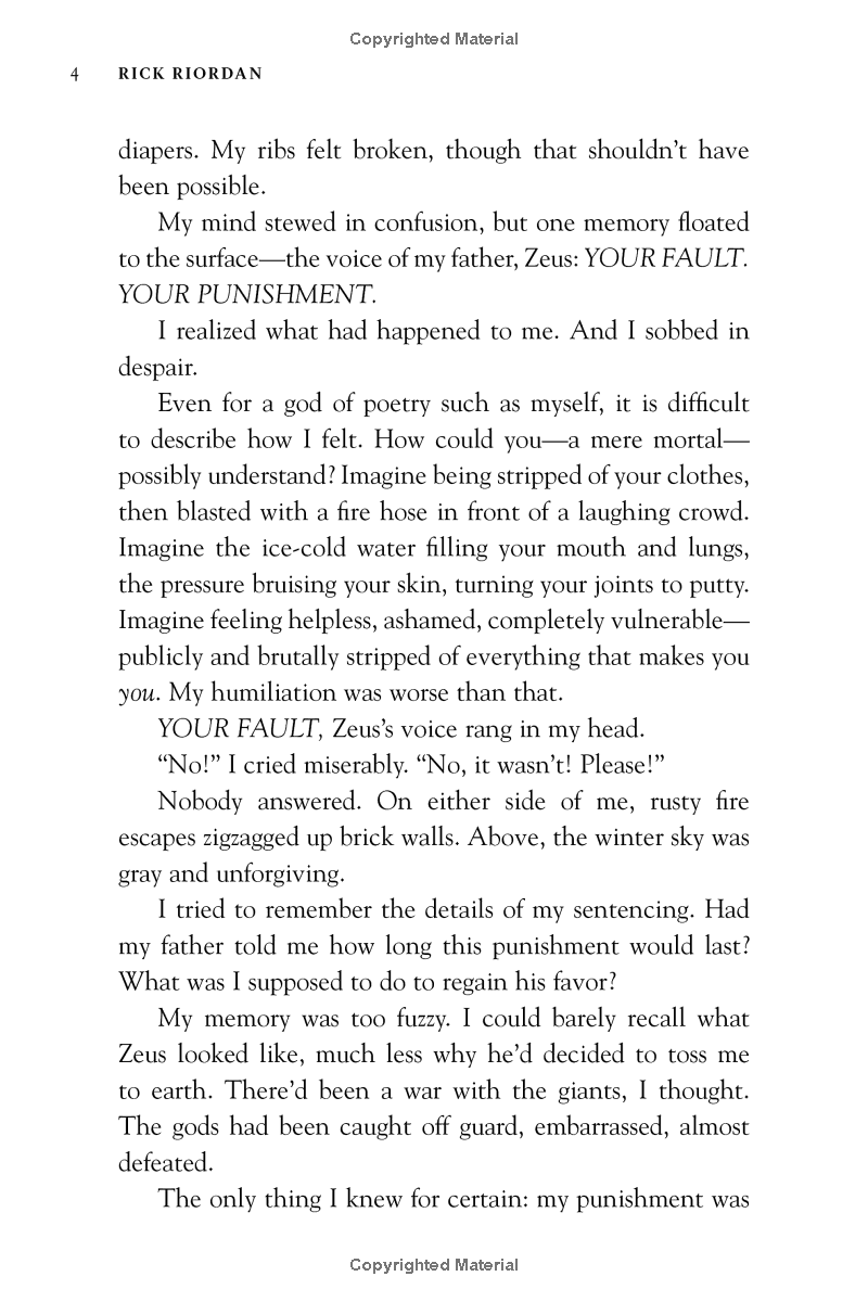 How do you punish an immortal?By making him human.After angering his father Zeus, the god Apollo is cast down from Olympus. Weak and disoriented, he lands in New York City as a regular teenage boy. Now, without his godly powers, the four-thousand-year-old deity must learn to survive in the modern world until he can somehow find a way to regain Zeus's favor.But Apollo has many enemies-gods, monsters, and mortals who would love to see the former Olympian permanently destroyed. Apollo needs help, and he can think of only one place to go . . . an enclave of modern demigods known as Camp Half-Blood.Also included, a bonus short story: "Percy Jackson and the Singer of Apollo"
