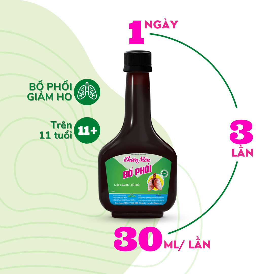 Mua tại TiktokPhổi là cơ quan rất quan trọng trong cơ thể người, có vai trò chính là trao đổi khí – mang O2 từ không khí vào tĩnh mạch phổi và đưa CO2 từ động mạch phổi ra bên ngoài. Ngoài ra, Phổi còn có chức năng chuyển hóa một số chất, lưu trữ máu và lọc các độc tố trong máu. Trong Đông Y, Phổi tương ứng với Tạng Phế, được chia thành Phế âm và Phế dương. Khi Phế suy yếu sẽ dẫn đến tình trạng ho khan, ho có đờm, ho về đêm, ho lâu ngày, cơ thể mệt mỏi và khó thở. Vì vậy, bổ phổi là điều rất cần thiết để chúng ta duy trì sức khỏe tốt. Thiên Môn Bổ Phổi kế thừa tinh hoa của nền Y học cổ truyền Việt Nam và là sự kết hợp của những vị thuốc Đông Y gồm: Thiên Môn Đông, Trần Bì, Bình Vôi, Kinh Giới, Bạc Hà, Gừng, Bách Bộ, Tang Bạch Bì và Atiso giúp bổ phổi, giảm ho hiệu quả và hỗ trợ giảm các triệu chứng ho khan, ho gió, ho có đờm, ho lâu ngày, ho về đêm, viêm họng, viêm phế quản,… Với thành phần thảo dược cực kỳ an toàn và lành tính, đây chính là thực phẩm bảo vệ sức khỏe chất lượng mà bạn không thể bỏ qua. Nhà phân phối: Công ty TNHH Dược Phẩm Bình Đông Số công bố: 8728/2020/ĐKSP Hạn sử dụng: 36 tháng kể từ ngày sản xuất (được in trên bao bì) Quy cách: Chai 280 ml dạng cao lỏng THÀNH PHẦN Thiên Môn Đông – 5,6 g Bạc Hà – 8,4 g Bách Bộ – 8,4 g Trần Bì – 5,6 g Tang Bạch Bì – 5,6 g Bình Vôi – 5,6 g Gừng – 2,8 g Kinh giới – 2,8 g Atiso – 2,8 g Phụ liệu: Đường kính, Natri benzoat, nước tinh khiết vừa đủ.
