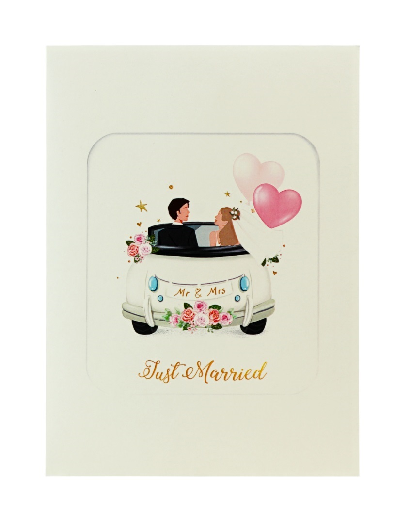 Tạo dấu ấn khó quên với thiệp 3D Pop Up xe cưới trắng Just Married. Khi mở ra, hình ảnh chiếc xe cưới bật nổi sang trọng, trang trí hoa hồng, bóng bay trái tim và quà tặng rực rỡ, kèm cặp đôi cô dâu chú rể hạnh phúc ngồi trên xe.