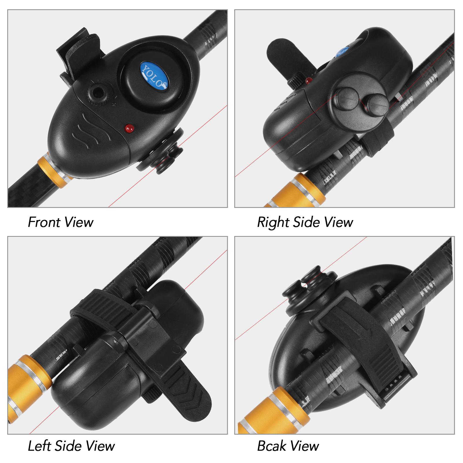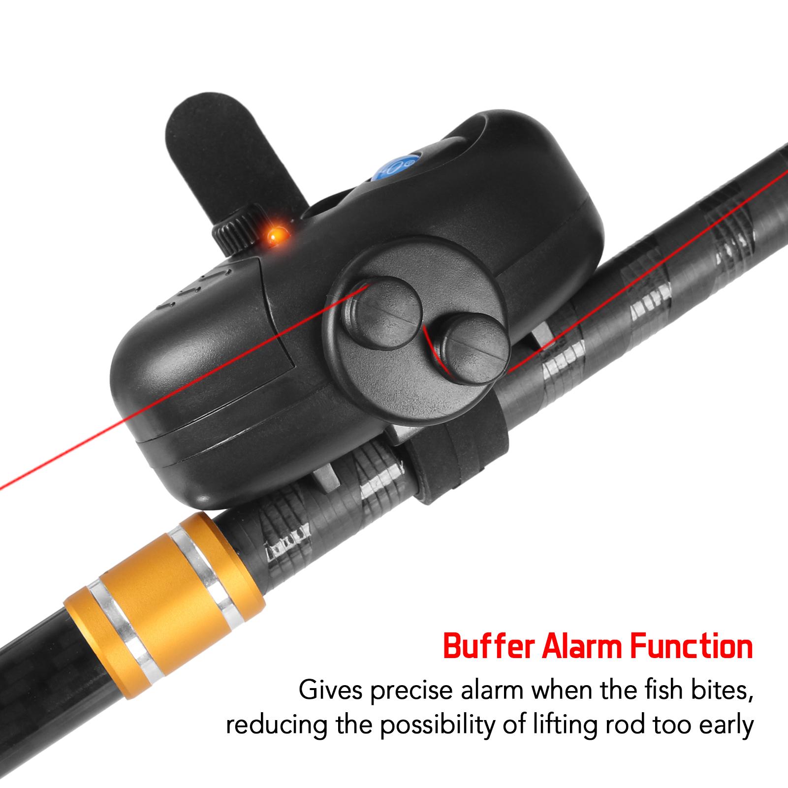 Features: Loud sound alarms when fish is on bite, adjustable volume for different needs. LED light increases visibility, convenient for night fishing. Buffer alarms give precise signal and prevent lifting rod too early. Adjustable strap