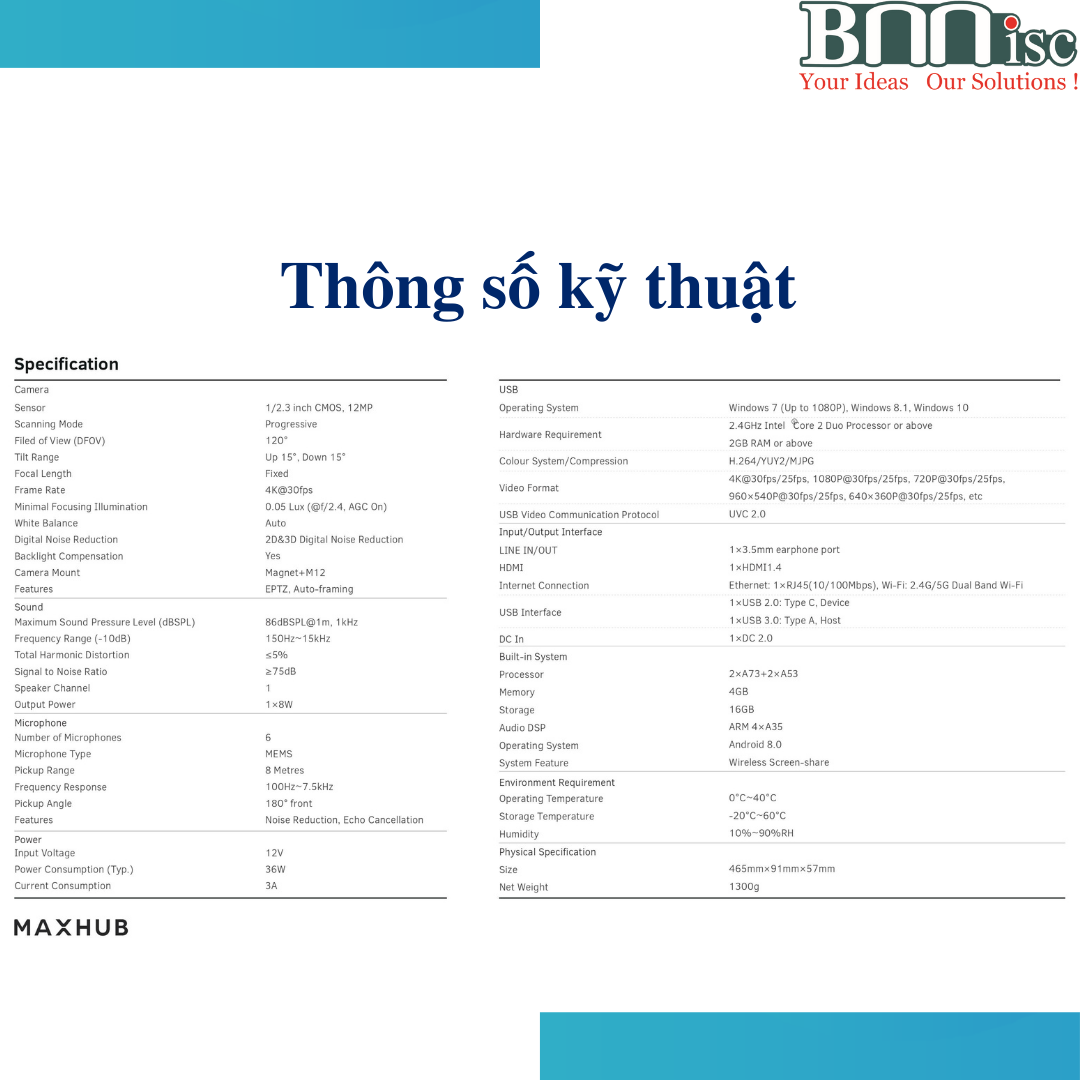 Hệ thống Hội Nghị Truyền Hình chuyên nghiệp MaxHub Camera : - Len kính Sony Type 1/2.3, CMOS, 12.3 MP , 4K@30fps, e-PTZ - Góc quay 120° , Lên/Xuống 15° , Tự động cân bằng