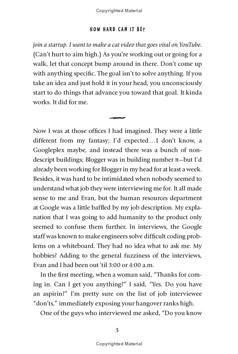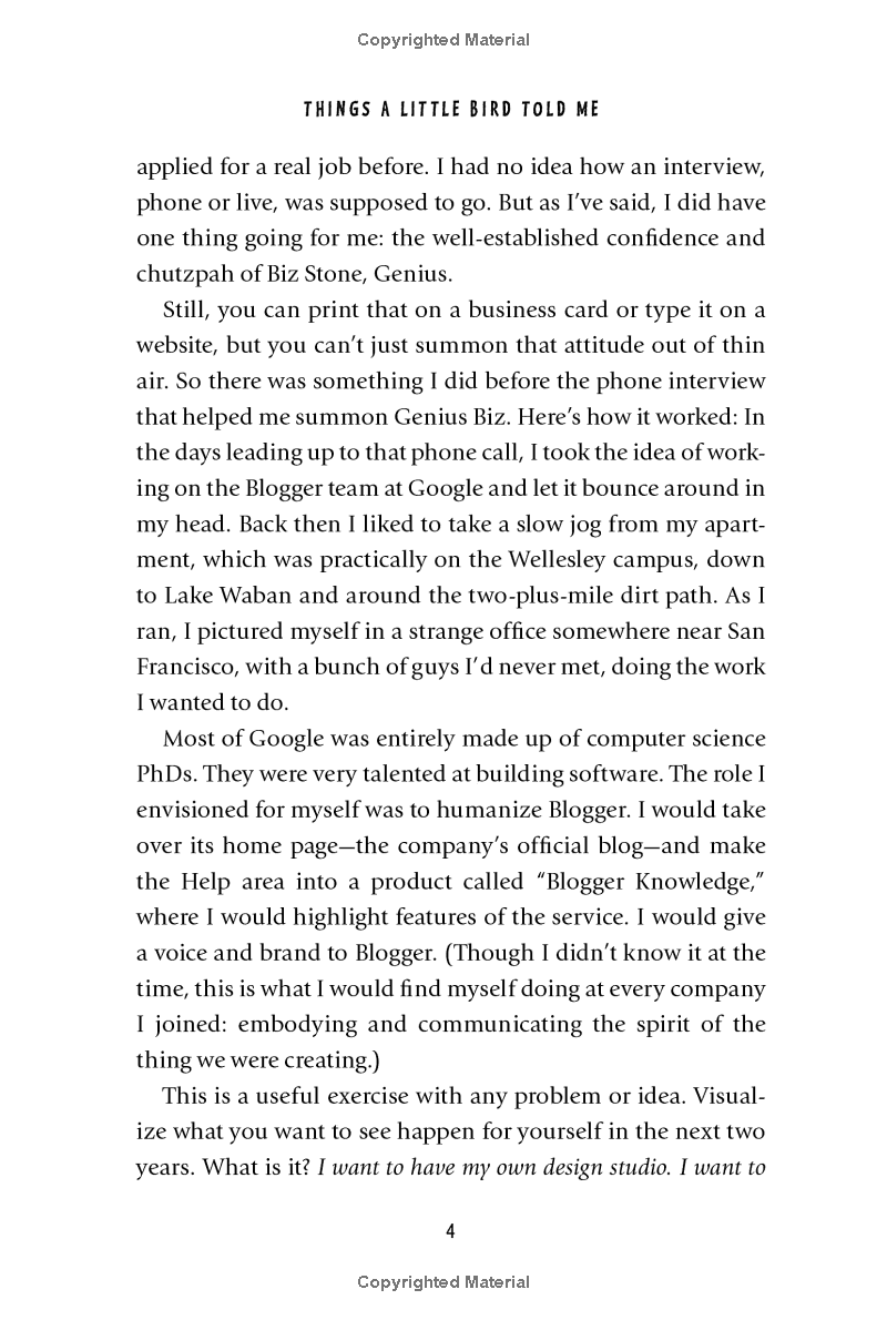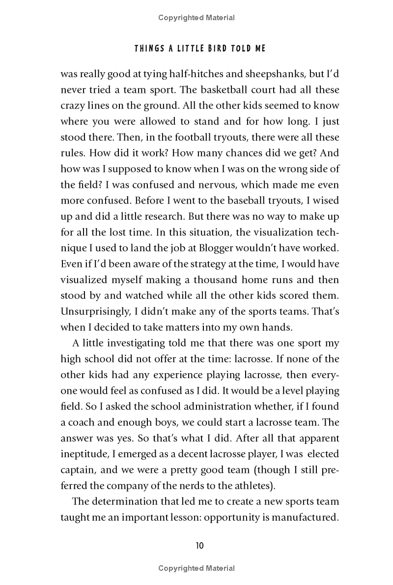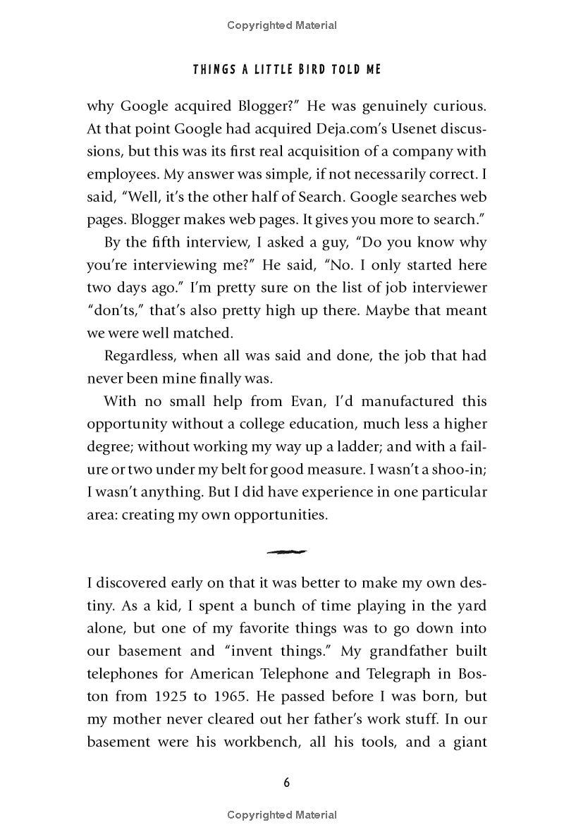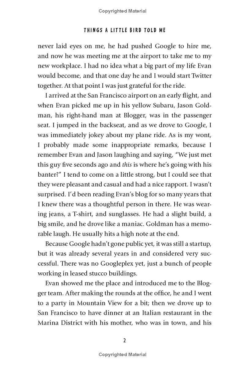 Now, Biz tells fascinating, pivotal, and personal stories from his early life and his careers at Google and Twitter, sharing his knowledge about the nature and importance of ingenuity today. In Biz's world: -Opportunity can be manufactured -Great work comes from abandoning a linear way of thinking -Creativity never runs out -Asking questions is free -Empathy is core to personal and global success In this book, Biz also addresses failure, the value of vulnerability, ambition, and corporate culture. Whether seeking behind-the-scenes stories, advice, or wisdom and principles from one of the most successful businessmen of the new century, Things A Little Bird Told Me will satisfy every reader.