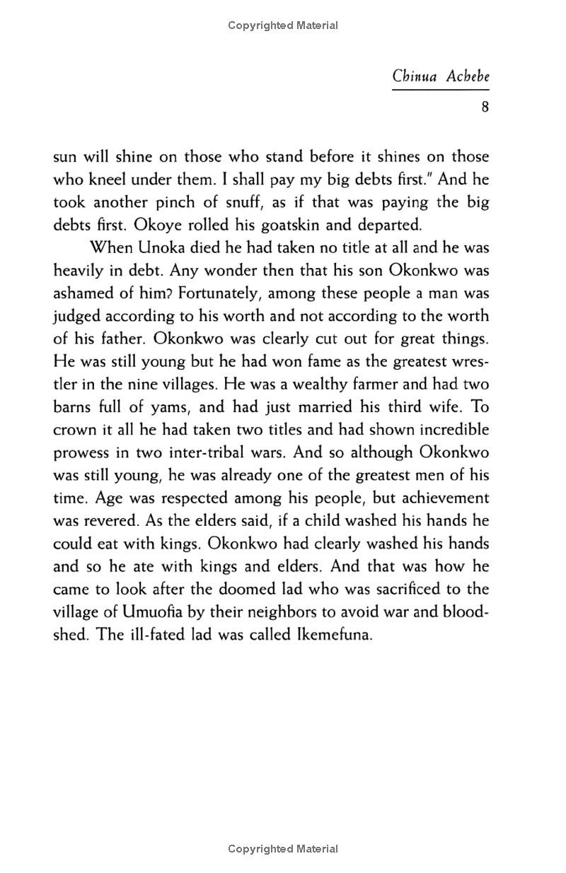 Things Fall Apart is the first of three novels in Chinua Achebe's critically acclaimed African Trilogy. It is a classic narrative about Africa's cataclysmic encounter with Europe as it establishes a colonial presence on the continent. Told through the fictional experiences of Okonkwo, a wealthy and fearless Igbo warrior of Umuofia in the late 1800s, Things Fall Apart explores one man's futile resistance to the devaluing of his Igbo traditions by British political andreligious forces and his despair as his community capitulates to the powerful new .